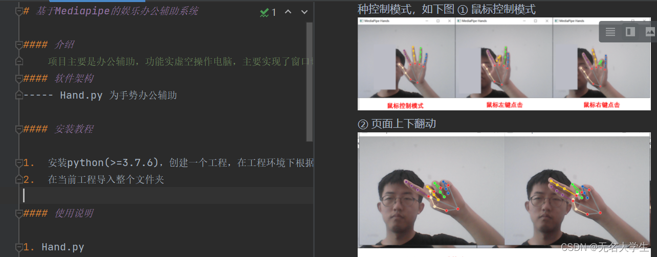 此项目的核心内容是使用mediapipe库和pyautogui实现使用电脑摄像头进行手势识别,实时控制电脑鼠标完成移动、左右键、上下翻页,以及切换页面的功能。