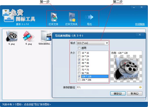 支持图标大小:16x16,24x24,32x32,48x48,64x64,72x72,96x96,128x128,256x256与512x512