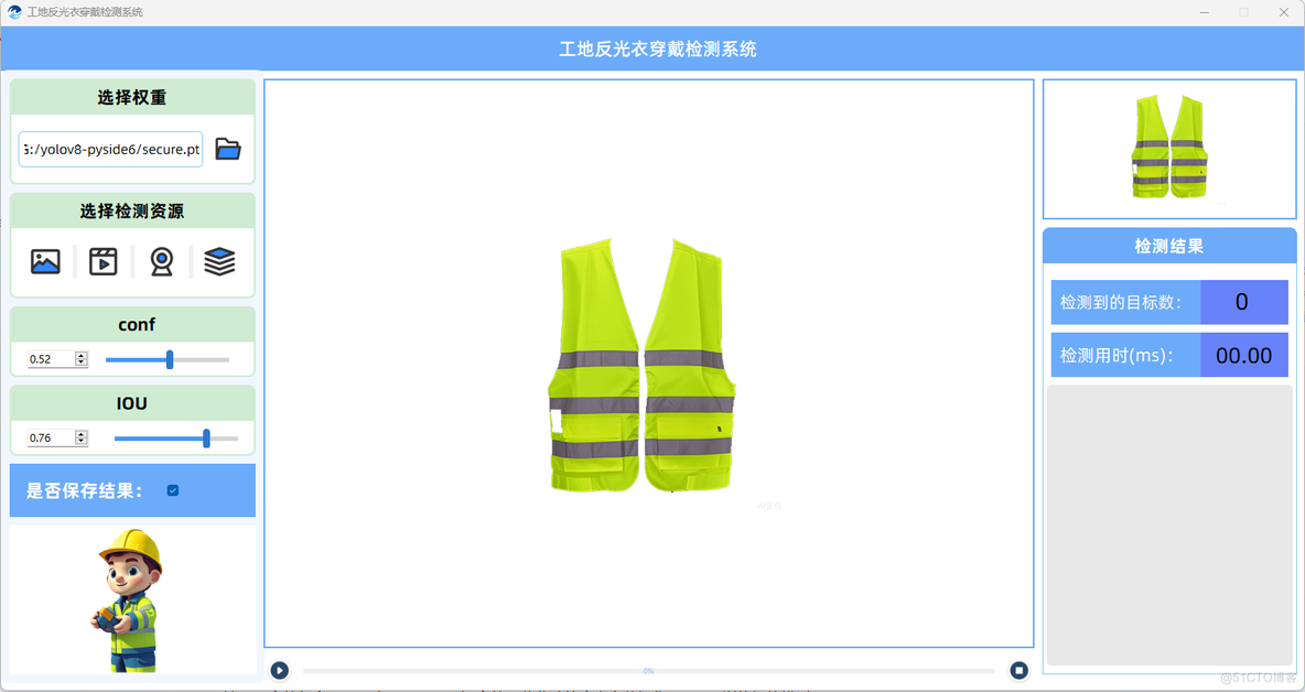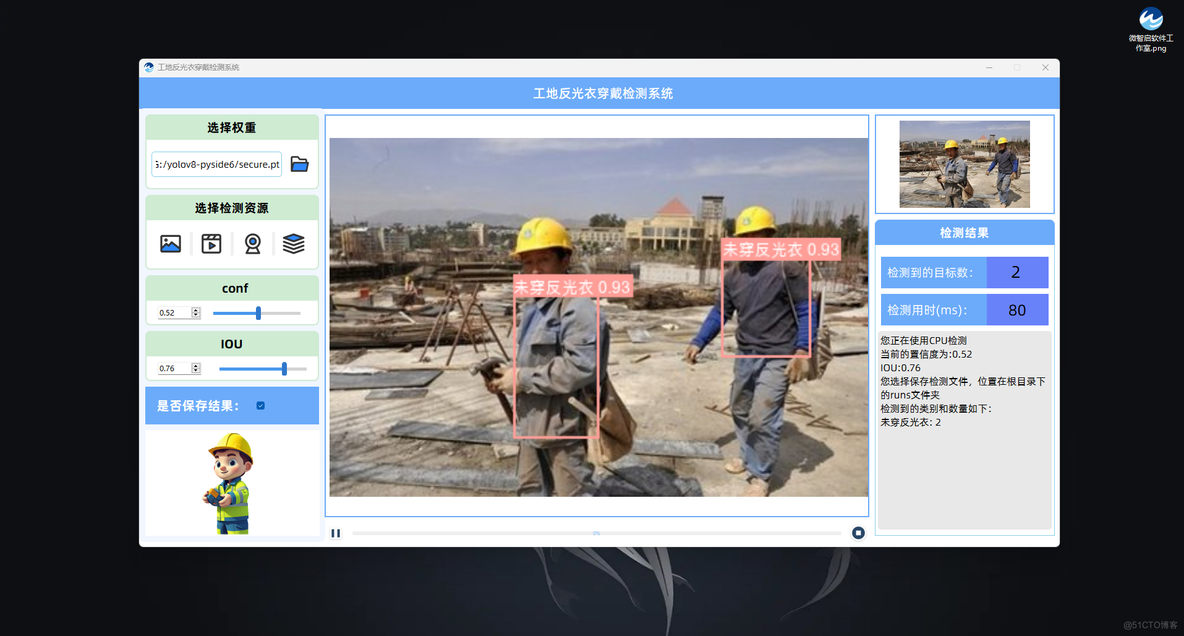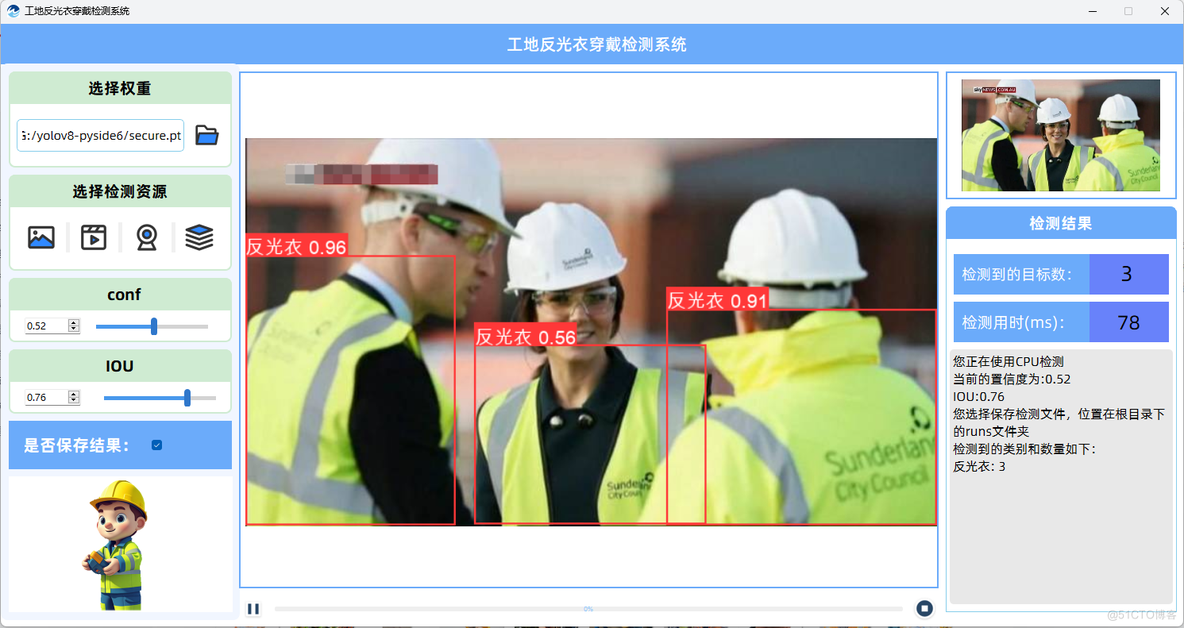 因此,开发一个工地反光衣检测系统,对于确保工地安全、提高工作效率、降低事故率具有重要意义。该系统能够自动检测工人是否穿着反光衣、反光衣是否符合安全标准以及是否正确穿着,从而为工地安全管理提供技术支持。通过实时监控和预警,该系统有助于提升工地安全管理水平,保障工人的生命安全,同时也符合国家安全生产的法律法规要求。