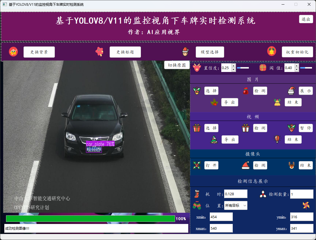 基于YOLOV8/V11的监控视角下车牌实时检测系统通过先进的图像处理和人工智能技术,实时检测室内场景下车牌目标的情况,保障车牌检测效果。本文基于YOLOv11算法框架,通过4348张监控场景的训练图片(支持黄牌、蓝牌、绿牌、黑牌、白牌车牌)(其中3478张训练集,870张验证集),训练出一个可用于检测监控场景下车牌的有效模型。此外,为更好地展示算法效果,基于此模型开发了一款带GUI界面的基于YOLOV8/V11的监控视角下车牌实时检测系统,可用于实时检测车牌情况,以及时告警。该系统是基于Python和Pyside6开发,并支持以下功能特性: