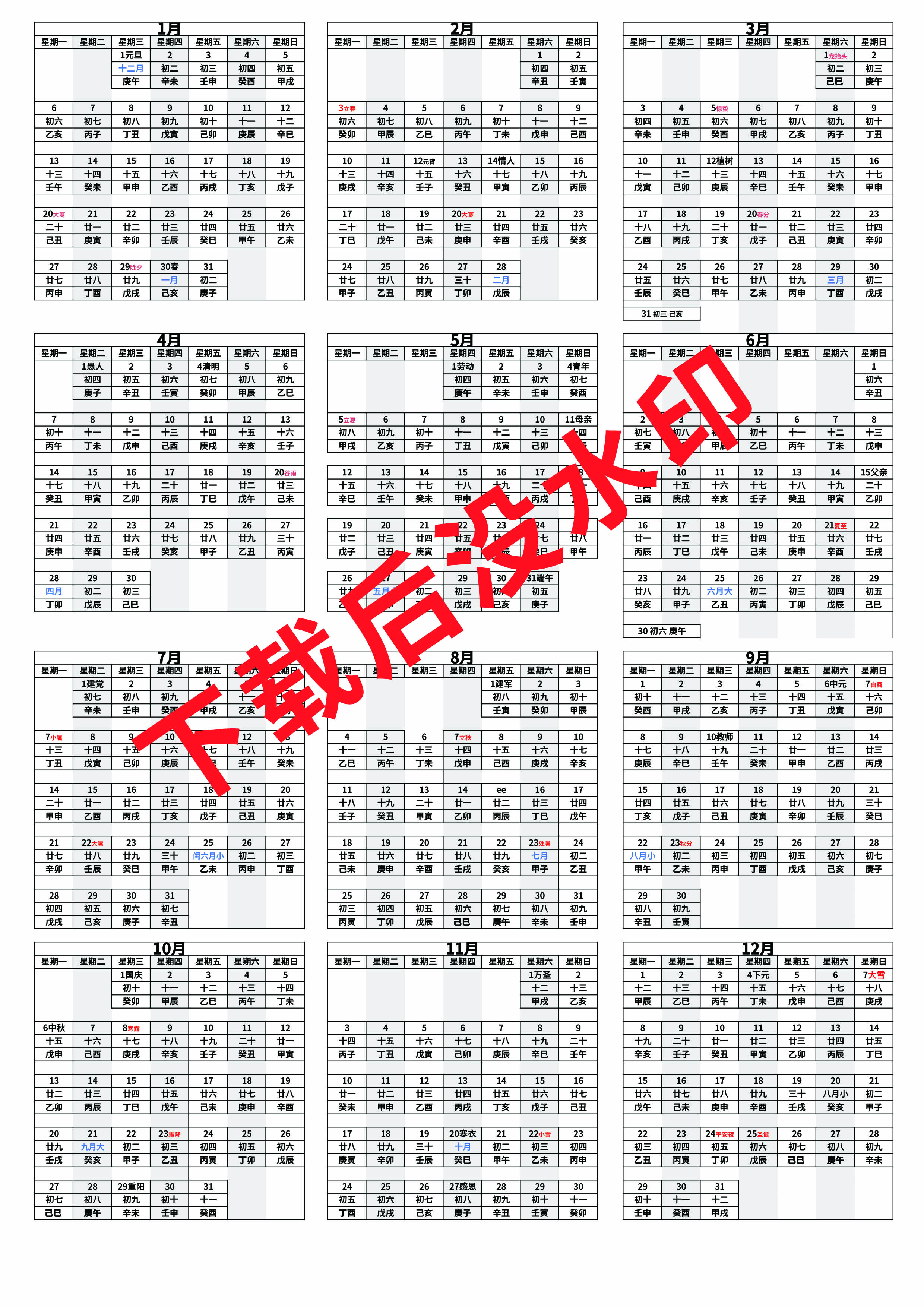 2025年日历全年表打印版,完整版日历带农历,甲子日子丑寅卯辰巳午未申酉戌亥时间表,甲乙丙丁戊己庚辛壬癸日期。