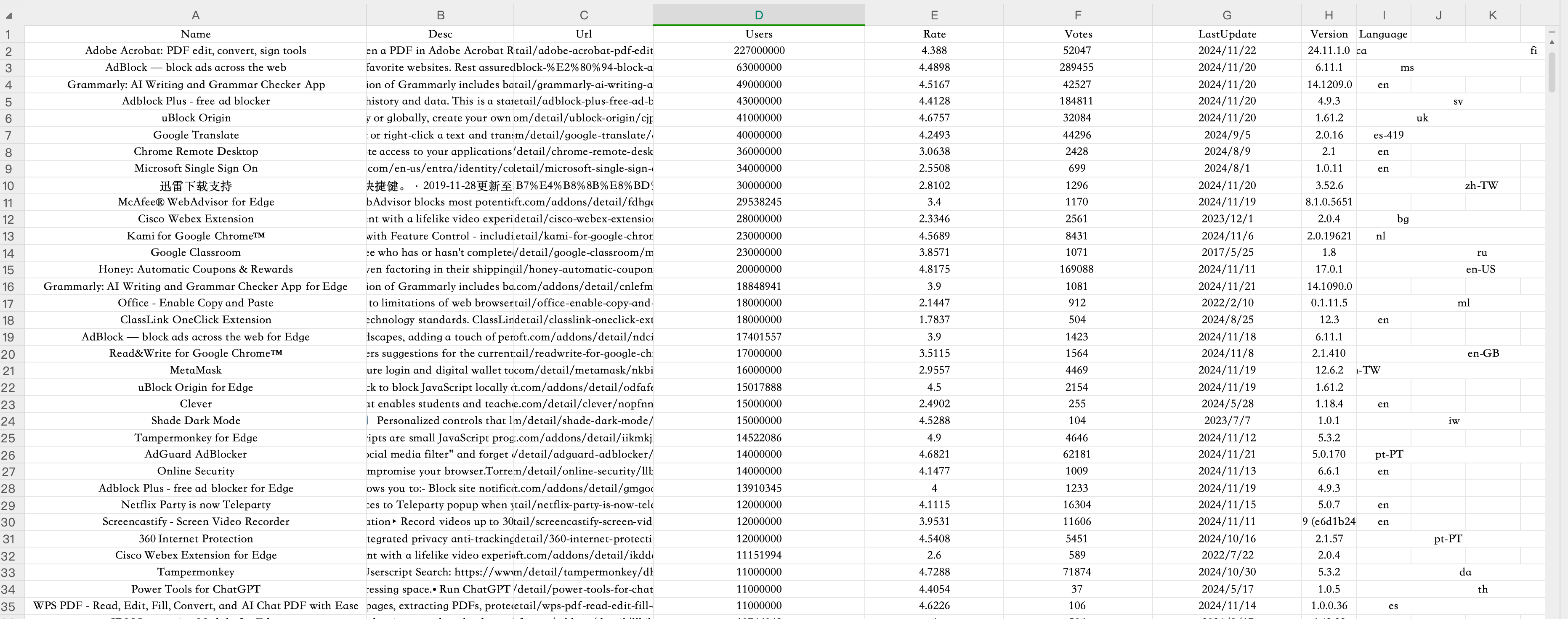 爬取了Chrome Store 上安装量最大的前5000个插件,包含了插件名、插件功能介绍、下载地址、安装量、评分、投票数、最后更新时间以及插件版本。 通过这些数据我们可以找到一些安装量不小、但是用户评分不高的插件,自己去看下用户对于插件评分不高的原因,然后根据用户的这些痛点,再去开发一个类似的插件并且在原有基础上做一下微创新,然后就可以上线躺赢了。我已经找到了7、8个插件,准备再撸一把。