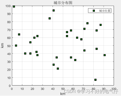 主要采用灰狼优化算法对城市间的路径进行规划。城市分布图如图所示。