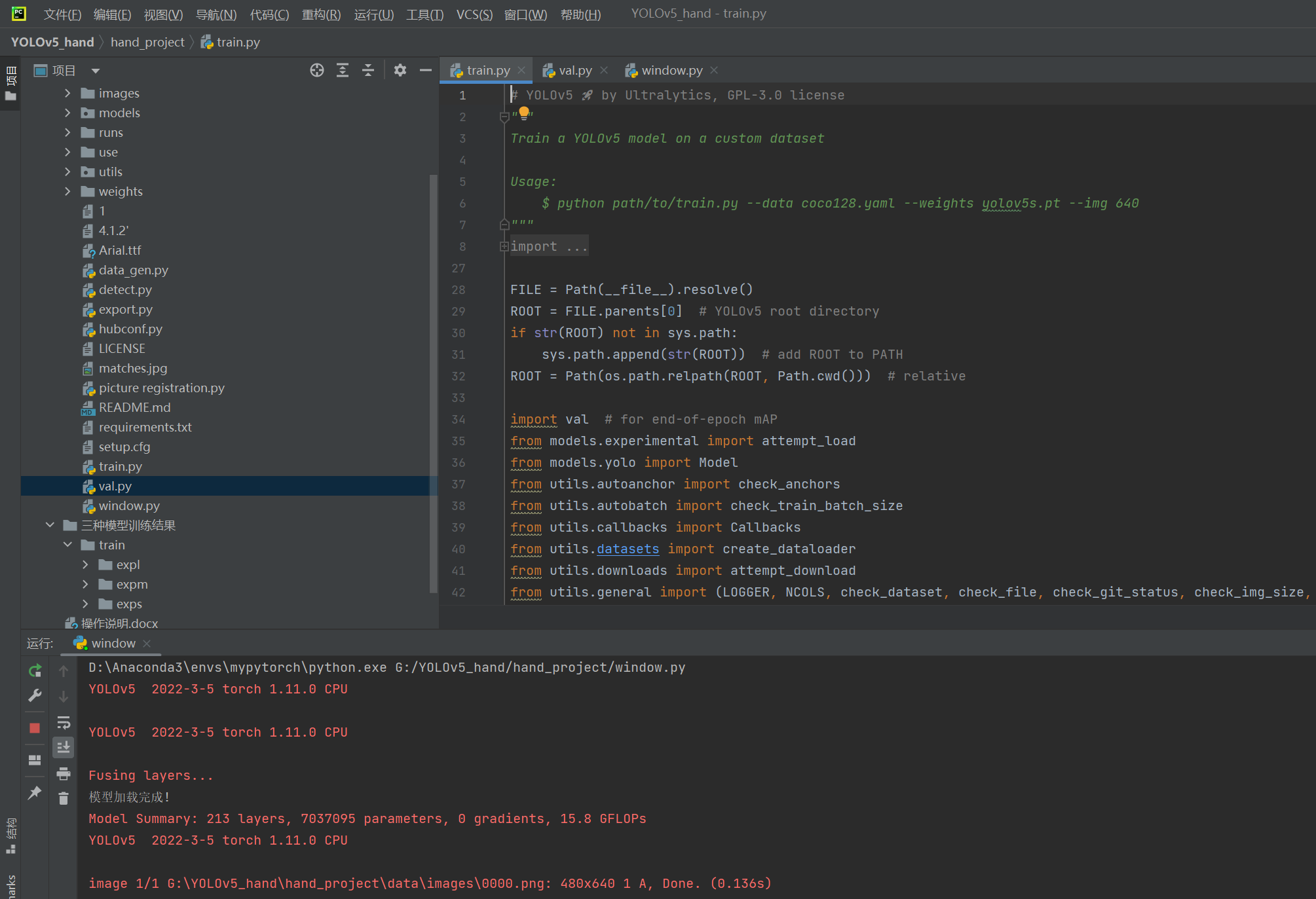功能:Python实现的手势识别系统,采用YOLOv5作为核心模型,内置三种YOLOv5模型训练结果(YOLOv5s/YOLOv5m/YOLOv5l)(可随意切换),并在PYQT界面中对各种结果实现可视化,用户可在PYQT界面中选择各种图片、视频、摄像头检测进行检测识别,并可随意更换检测模型。 用于智能检测物体种类并记录和保存结果,也可根据自己的数据集按内置详细教程切换原模型与三种已配置好的注意力机制模型进行模型训练。对各种物体检测结果可视化,提高目标识别的便捷性和准确性。给出Python的实现代码、预训练模型,以及PYQT界面设计。