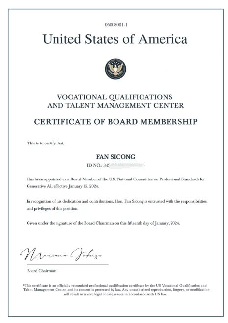 本手册作者是:美国生成式人工智能专业标准UVT国家委员会成员,美国生成式人工智能行业标准制定人。(共同制定者还有麻省理工学院)