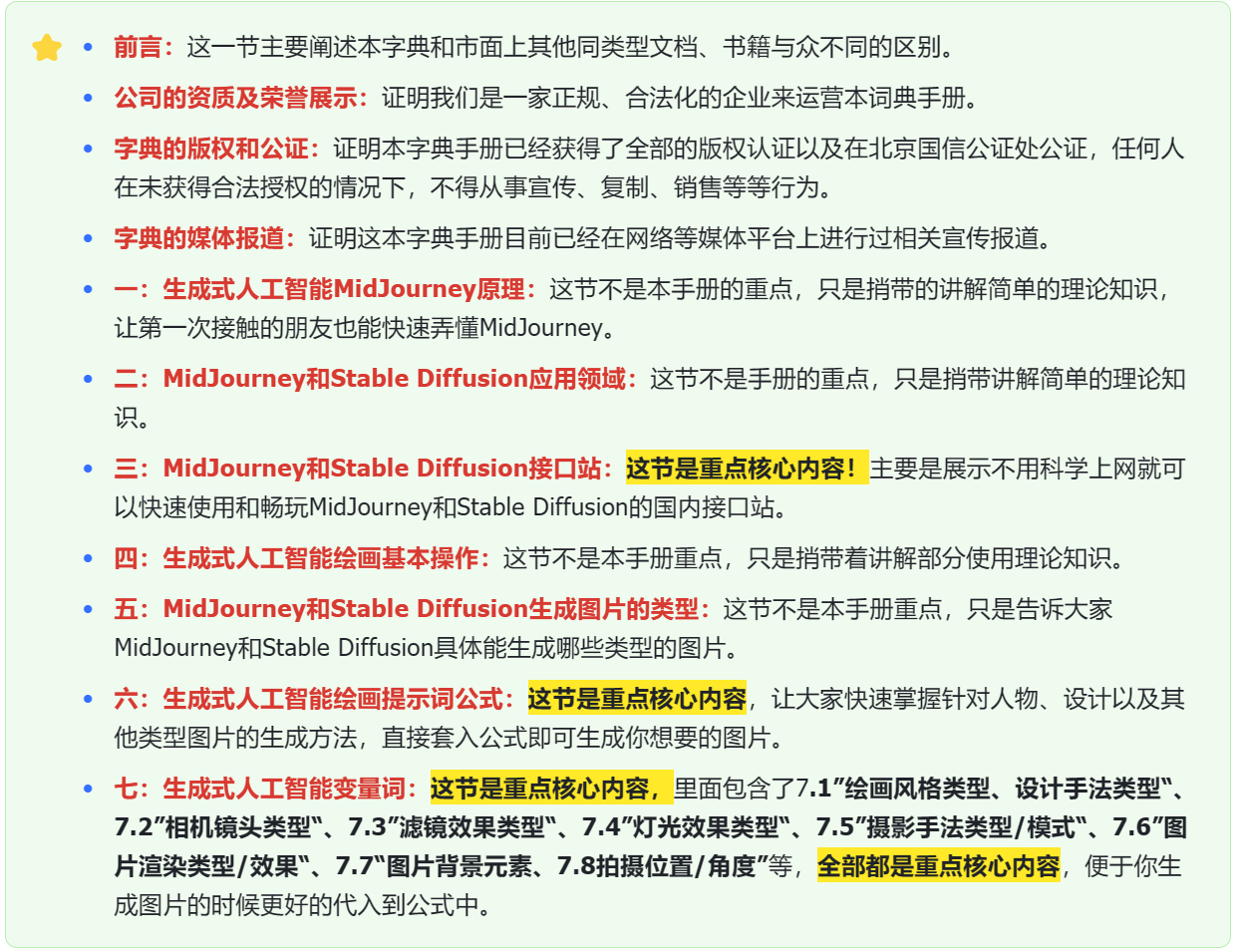 一个10岁的孩子拿到本手册也能成为设计大师,也能快速、简单的生成他想要的图片!整体手册目录如下:
