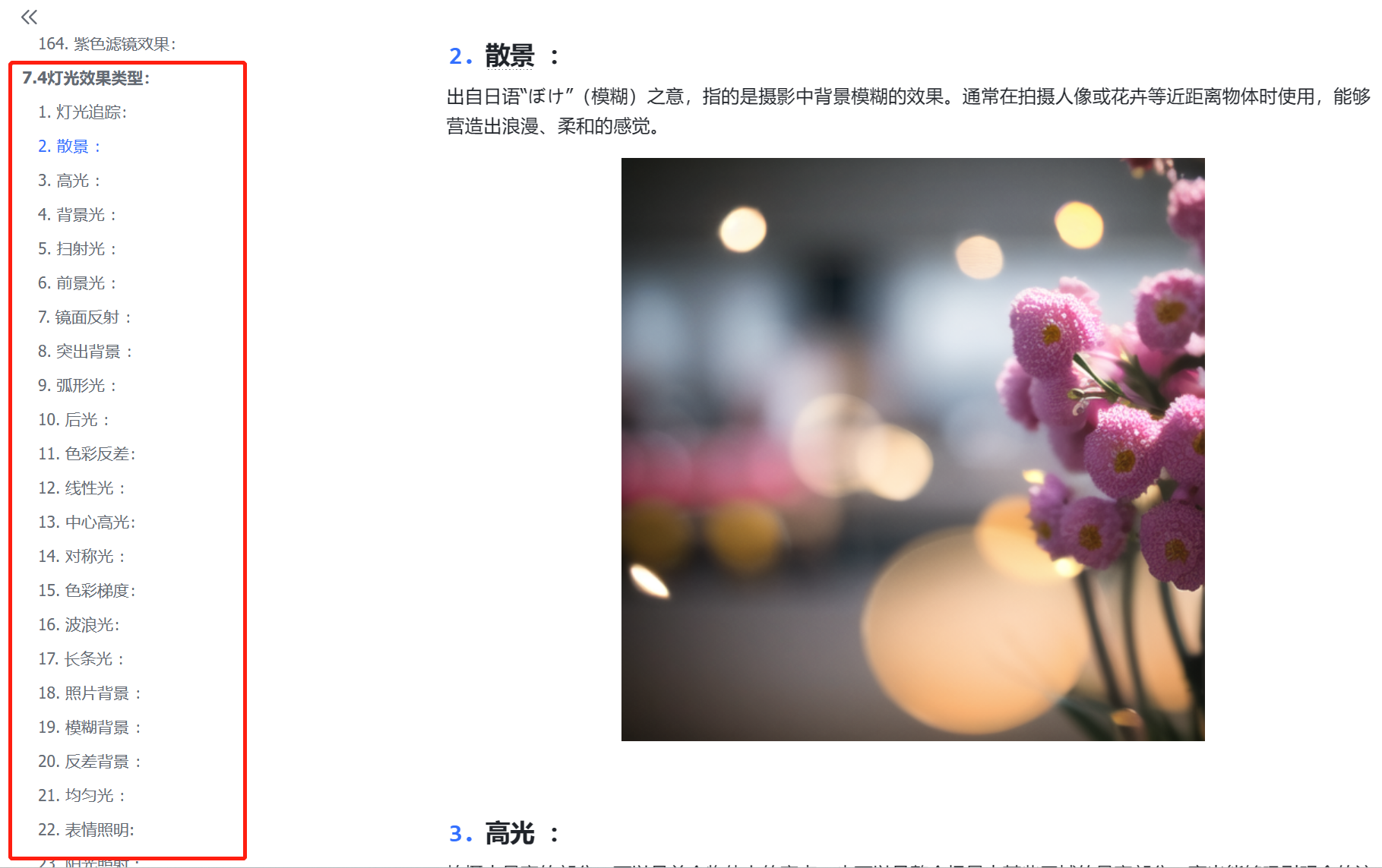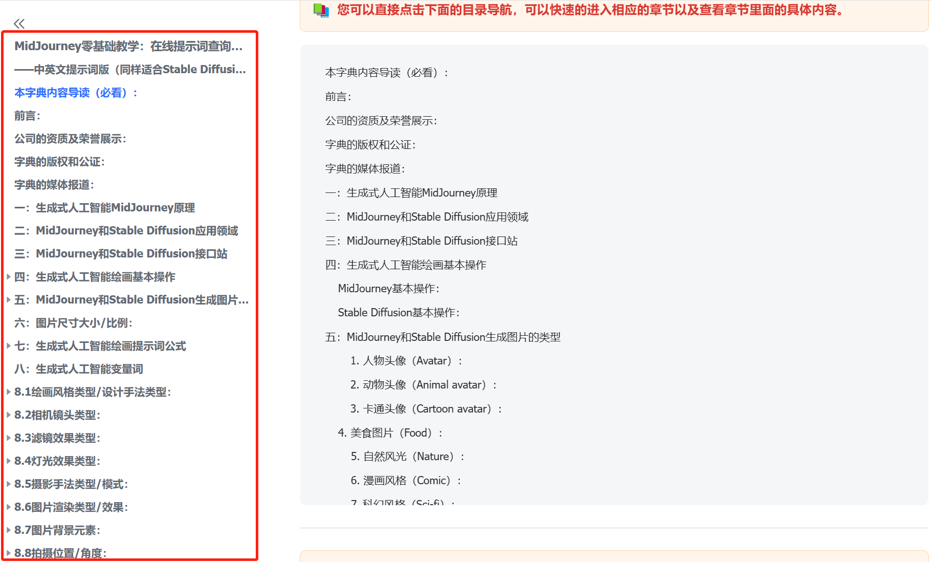 这本在线文档“字典”不仅可以让大家从零基础开始就可以轻松学会、掌握MidJourney以及Stable Diffusion的使用方法。同时本文档的重点部分在于涵盖了”绘画风格类型、设计手法类型“、”相机镜头类型“、“灯光效果类型”、”滤镜效果类型“、”摄影手法类型/模式“、”图片渲染类型/效果“、“图片背景元素”、“拍摄位置角度”等方面的大量专业知识点,而这些知识点的使用不同会直接影响到MidJourney和Stable Diffusion出图的效果。