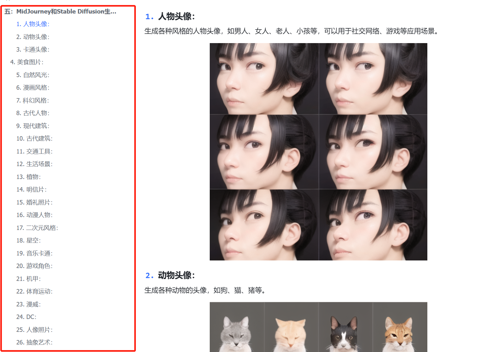 这节内容包含了110个小类目,每个类目都配备了一张生成出来的图片,让大家很容易知道MidJourney和Stable Diffusion生成出来的图片感觉。这节不是本手册的重点内容!