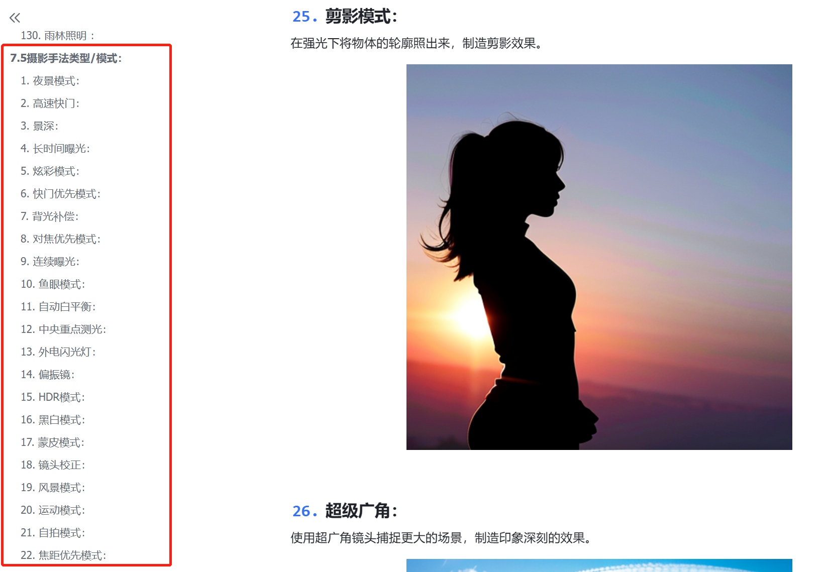 一共列举了105个常见的对摄影手法类型/模式,并且配有图片,供大家直观浏览和查询。作图时,请直接选择并代入到公式中即可。