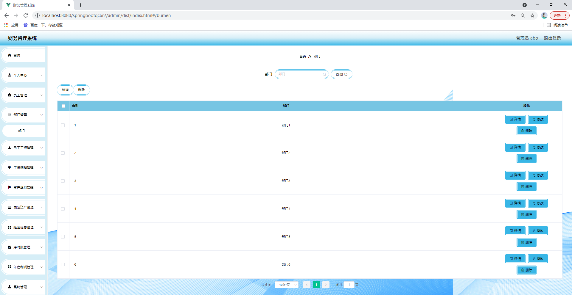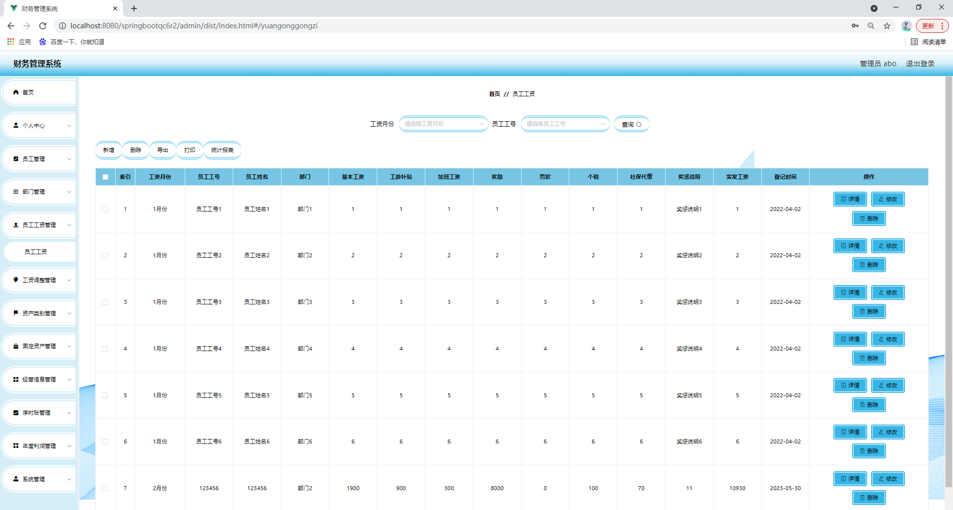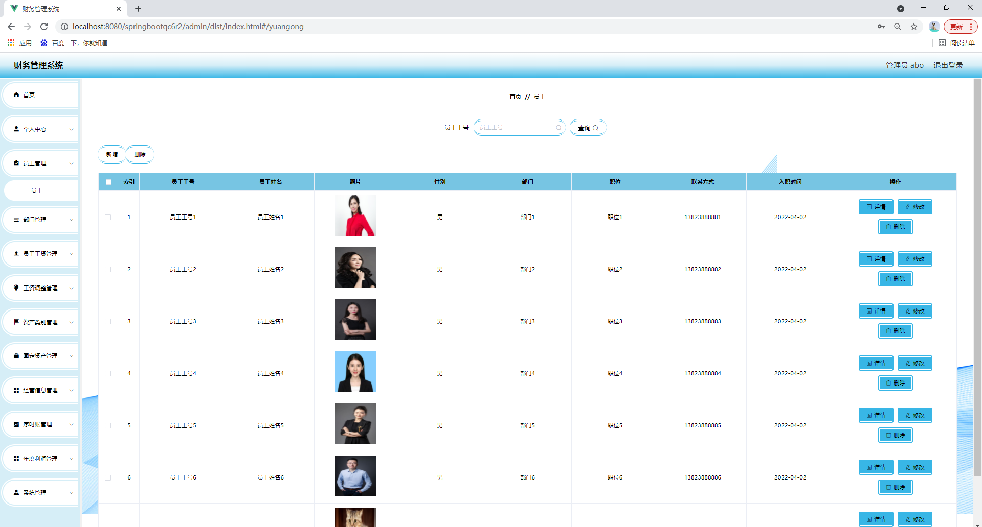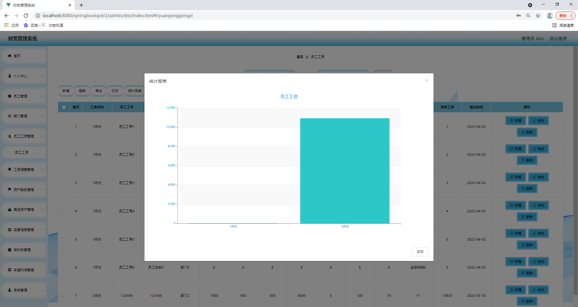 任何系统都要遵循系统设计的基本流程,本系统也不例外,同样需要经过市场调研,需求分析,概要设计,详细设计,编码,测试这些步骤,基于java技术、springboot框架、B/S机构、Mysql数据库设计并实现了财务管理系统。系统主要包括首页,个人中心,员工管理,部门管理,员工工资管理,工资调整管理,资产类别管理,固定资产管理,经营信息管理,序时账管理,年度利润管理,系统管理等功能模块。