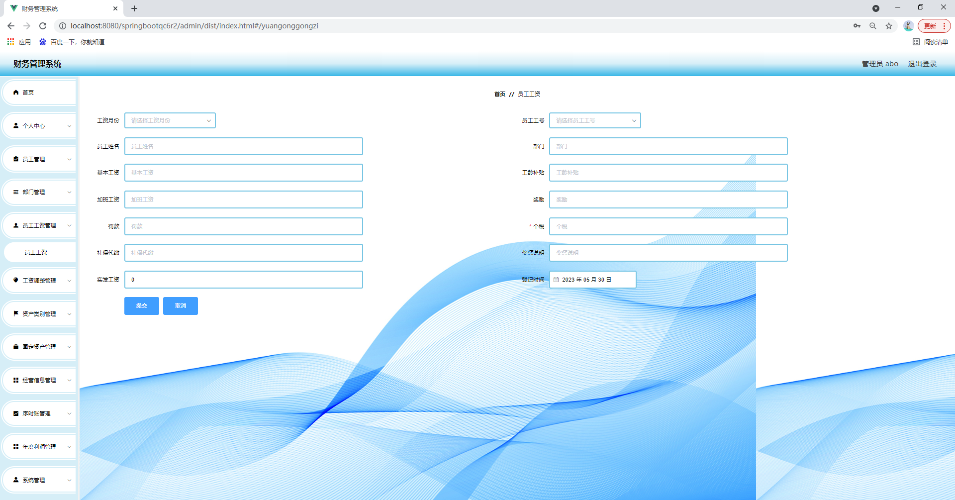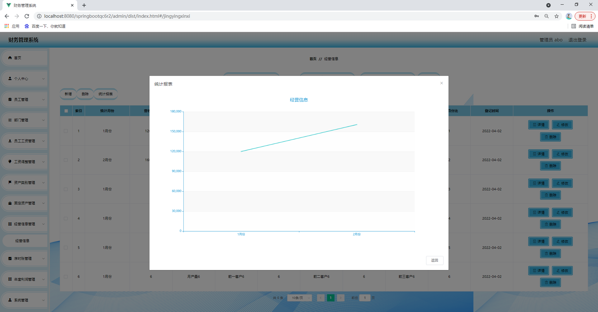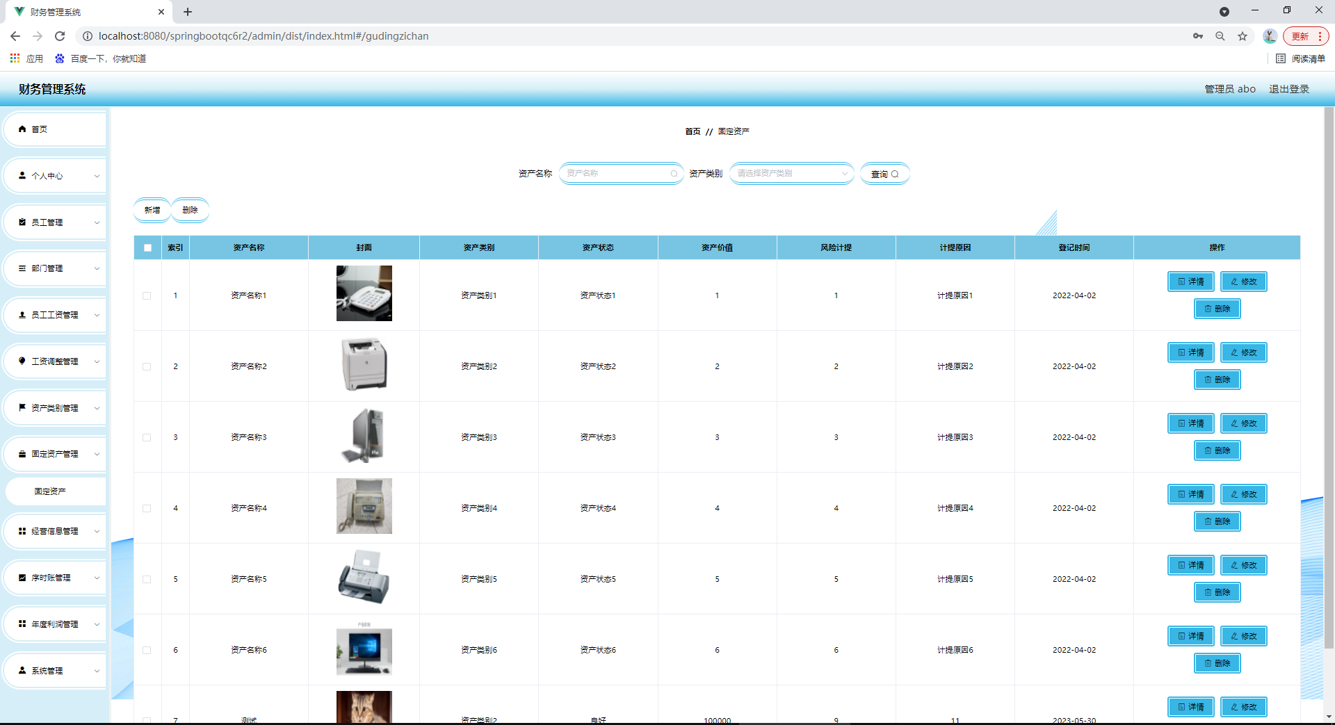 任何系统都要遵循系统设计的基本流程,本系统也不例外,同样需要经过市场调研,需求分析,概要设计,详细设计,编码,测试这些步骤,基于java技术、springboot框架、B/S机构、Mysql数据库设计并实现了财务管理系统。系统主要包括首页,个人中心,员工管理,部门管理,员工工资管理,工资调整管理,资产类别管理,固定资产管理,经营信息管理,序时账管理,年度利润管理,系统管理等功能模块。