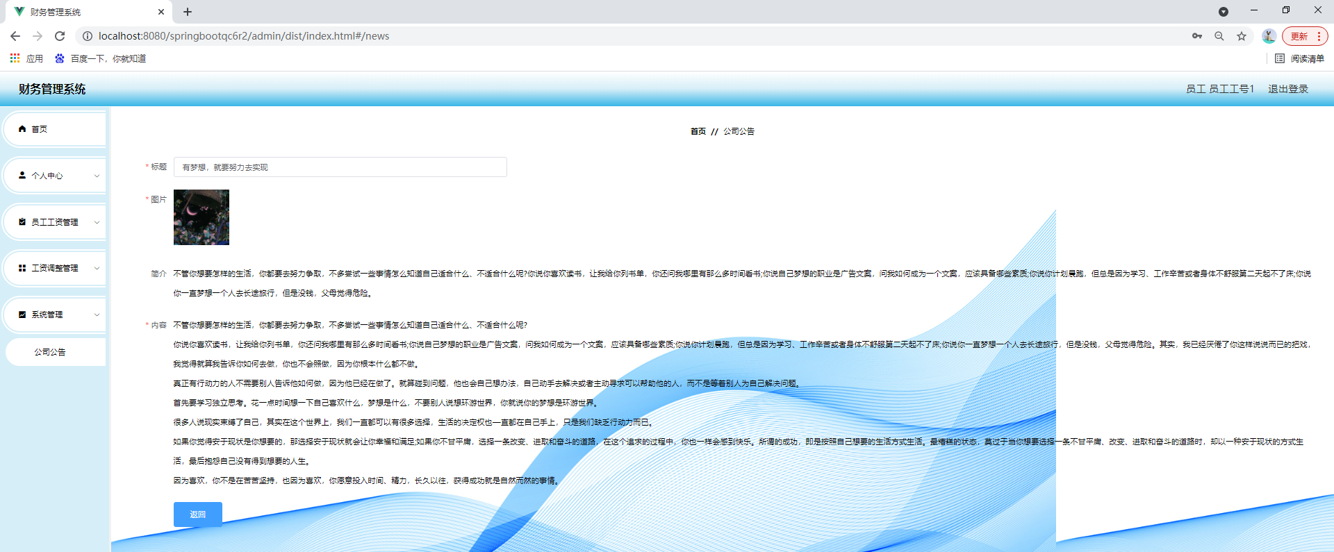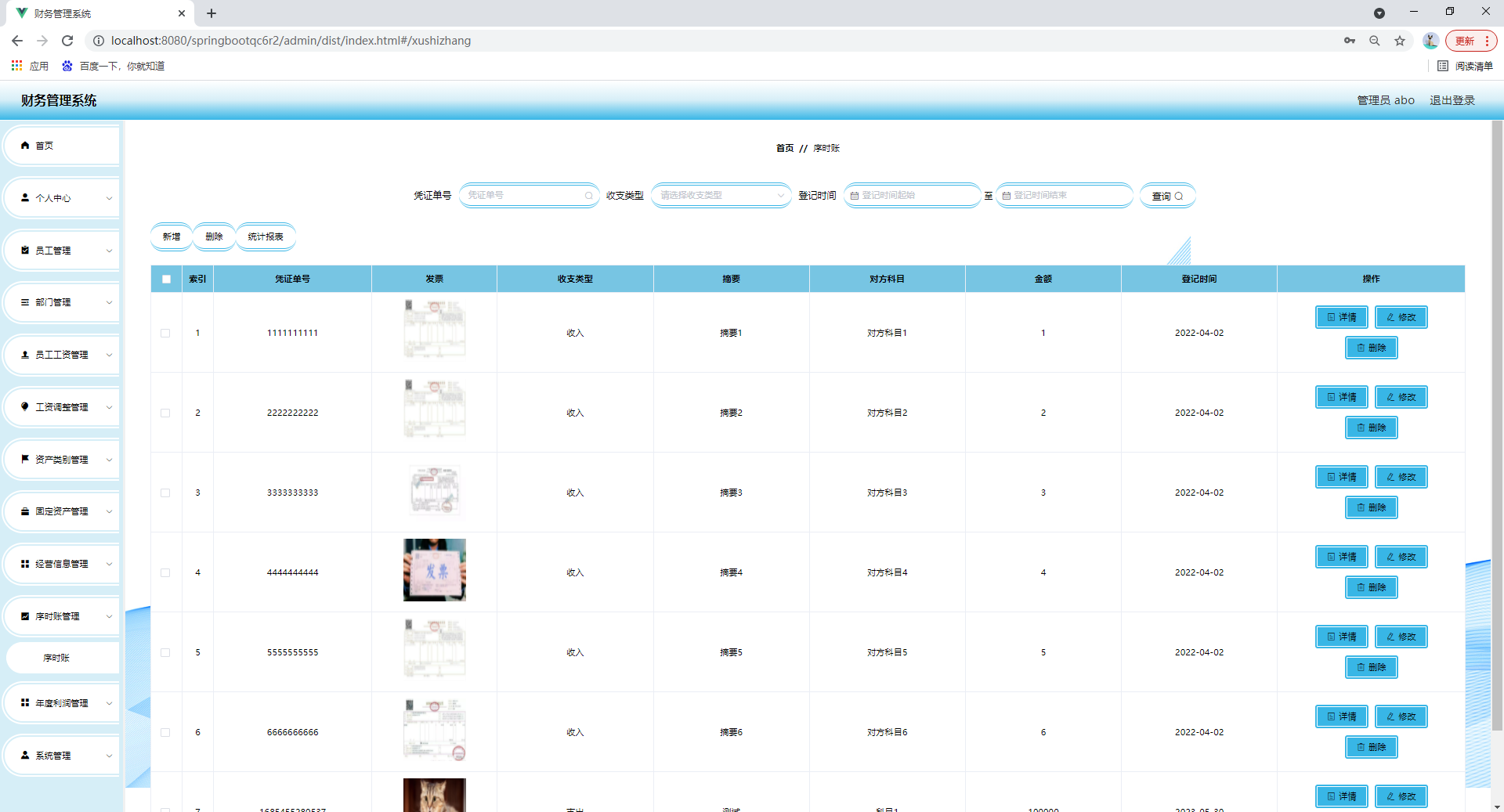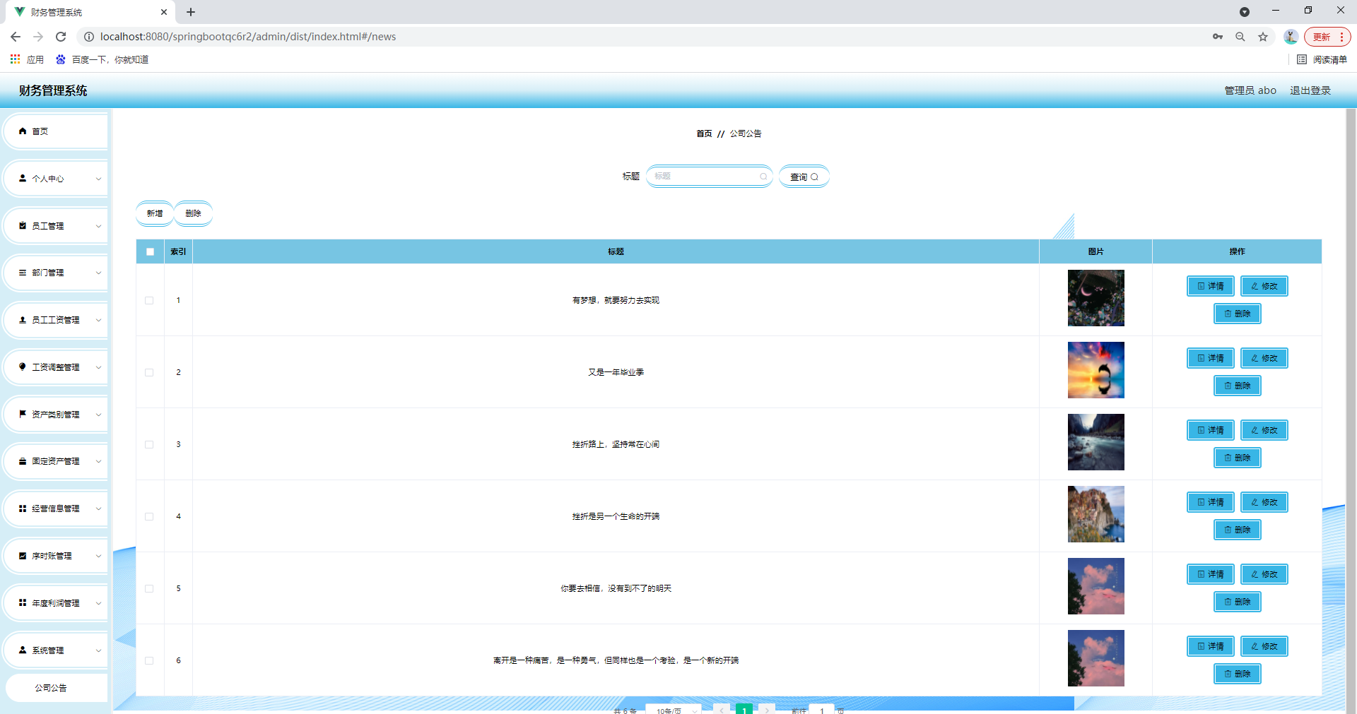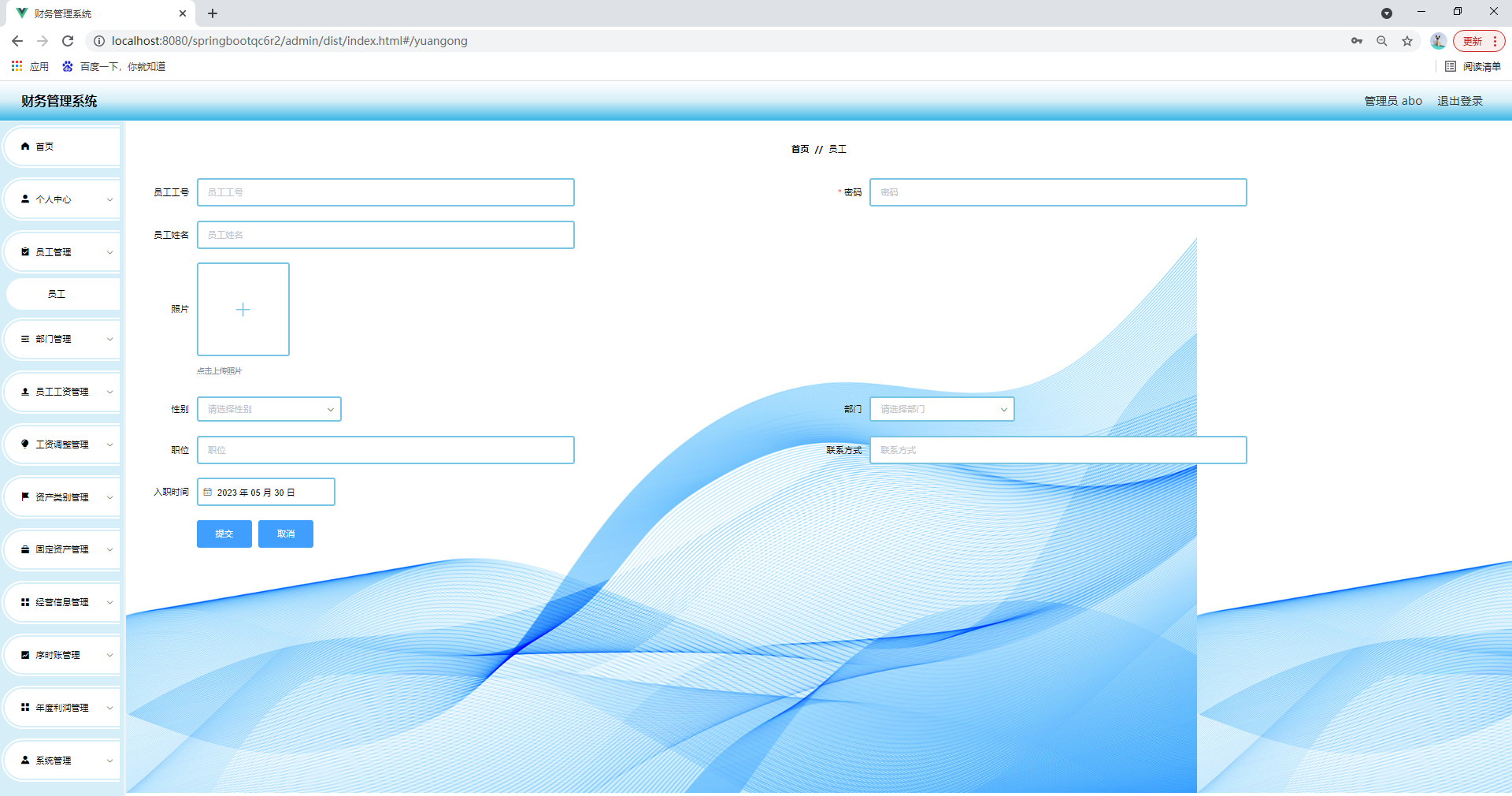 任何系统都要遵循系统设计的基本流程,本系统也不例外,同样需要经过市场调研,需求分析,概要设计,详细设计,编码,测试这些步骤,基于java技术、springboot框架、B/S机构、Mysql数据库设计并实现了财务管理系统。系统主要包括首页,个人中心,员工管理,部门管理,员工工资管理,工资调整管理,资产类别管理,固定资产管理,经营信息管理,序时账管理,年度利润管理,系统管理等功能模块。