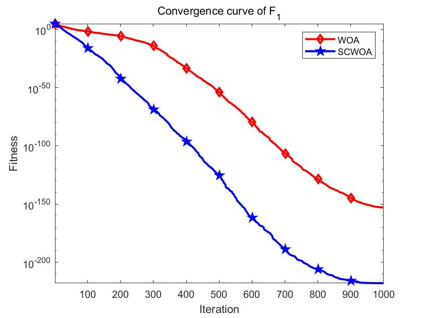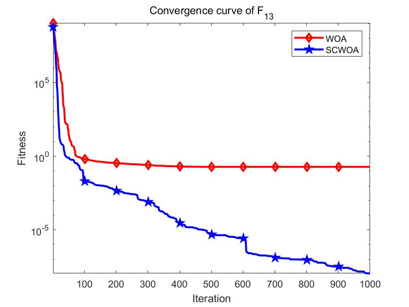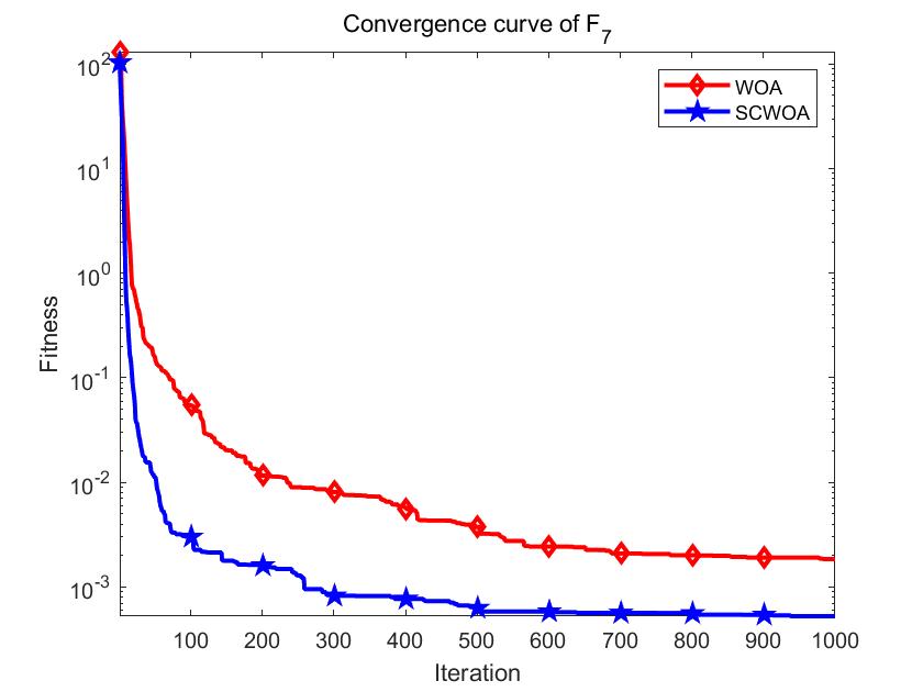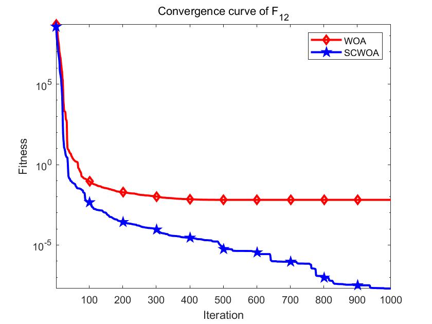 将标准鲸鱼优化算法 (WOA) 与基于随机重心动态反向学习技术的鲸鱼优化算法 (SCWOA)在单峰函数F1,F7,多峰函数F12,F13上的结果进行比较,收敛曲线图如下所示: