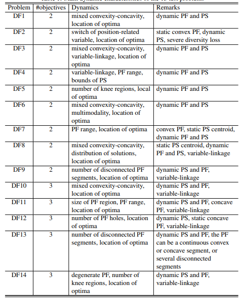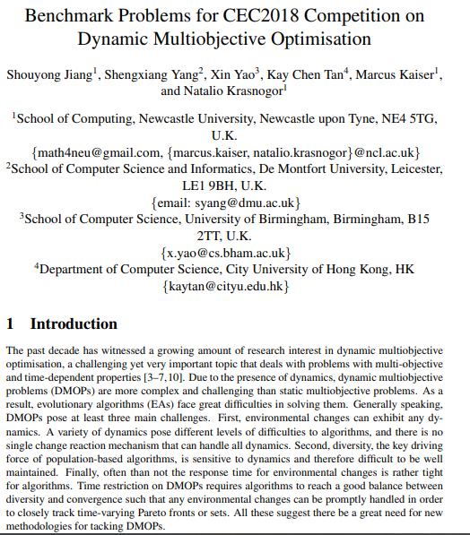 [1] Jiang S , Yang S , Yao X ,et al.Benchmark Functions for the CEC'2018 Competition on Dynamic Multiobjective Optimization[J]. 2018.