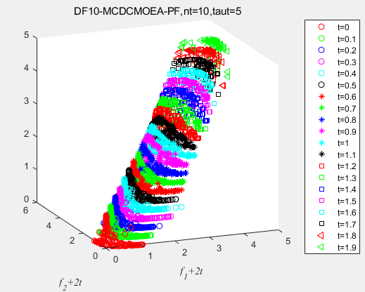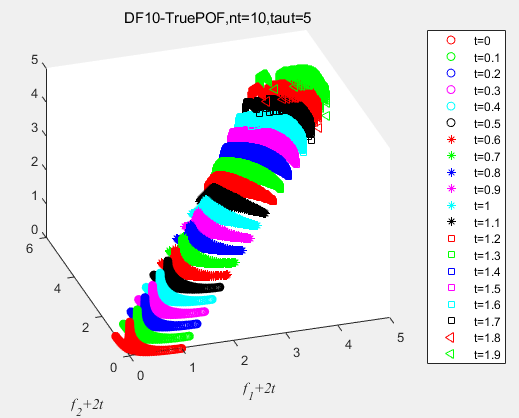 现实生活中,存在许多动态多目标优化问题(Dynamic Multi-objective Optimization Problems,DMOPs),这类问题的目标函数之间相互矛盾,并且目标函数、约束或者参数都可能随着时间的变化而发生变化.这种随时间不断变化的特性,给解决DMOPs带来了挑战,算法不仅要能够追踪到最优解,同时还要求算法能够快速地对发生的变化做出响应。CEC2018:动态多目标测试函数DF10~DF14的PS及PF(提供Matlab代码)_IT猿手的博客-CSDN博客