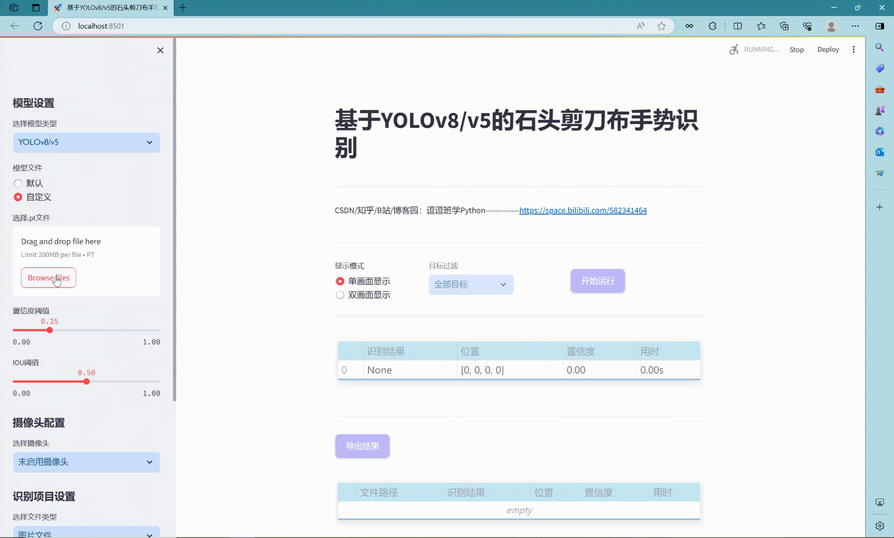 功能:基于YOLOv8/v5的石头剪刀布手势识别系统,同时采用YOLOv8和YOLOv5深度学习算法,基于Streamlit的交互式Web应用界面设计。在Web网页中可以支持图像、视频和实时摄像头进行石头剪刀布手势识别,可上传不同训练模型(YOLOv8/v5)进行推理预测,在网页上显示检测结果,也可选择单个目标显示,检测过程结果记录并显示在网页表格中,可导出检测结果为csv文件和导出带标注框的结果视频文件。附带了完整的网页设计、深度学习模型代码、训练数据集的完整资源。