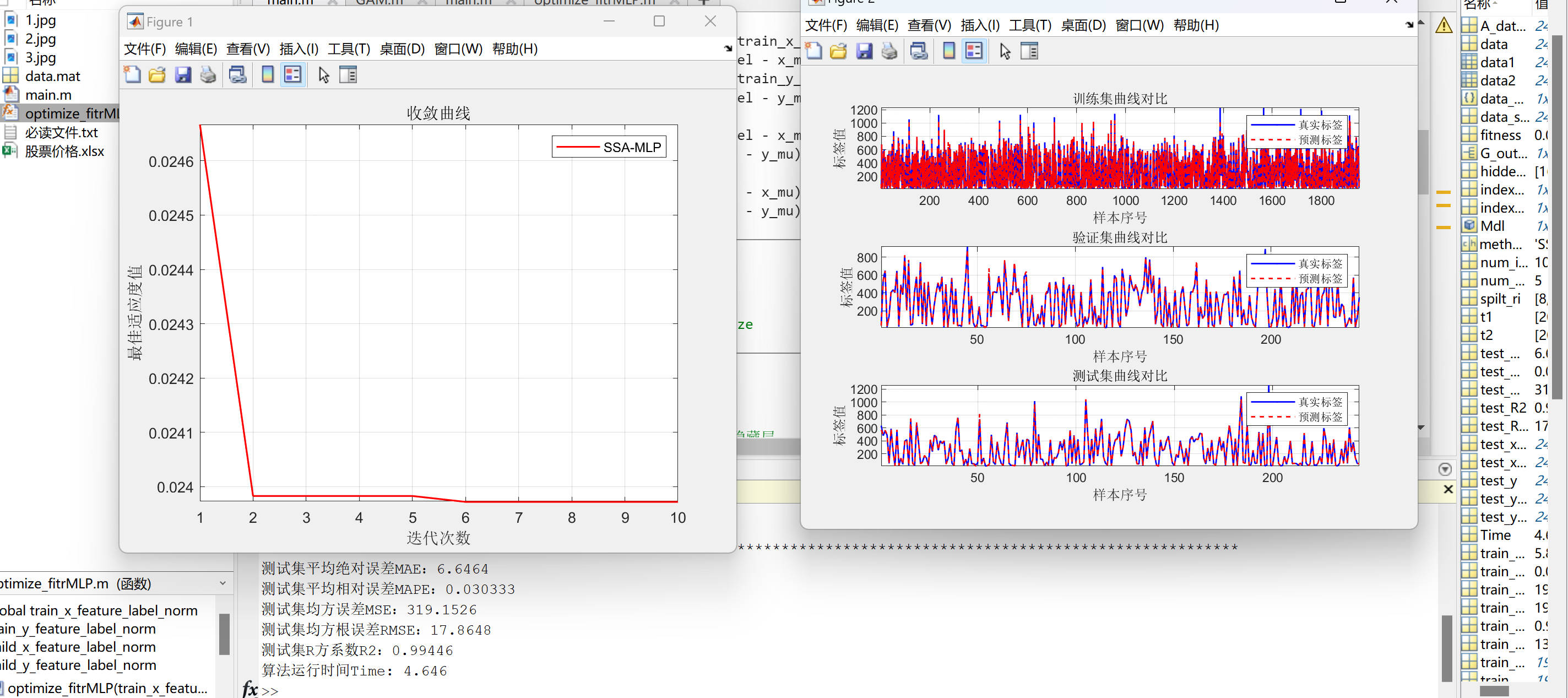 结果可视化:通过绘制SSA寻优过程收敛曲线、训练集、验证集和测试集的真实标签与预测标签的曲线对比图,直观地展示了模型的预测效果,便于用户理解算法和模型的性能。