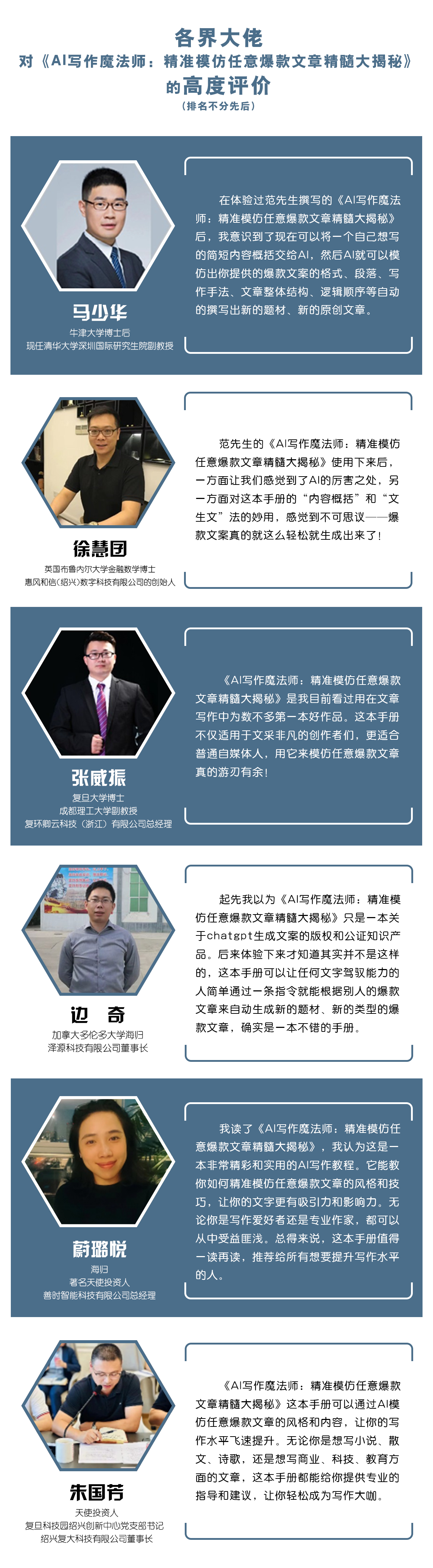 本手册和《AI写作魔法师:精准模仿任意爆款文章精髓大揭秘》属于姊妹篇,只不过本手册只适用于企业使用,实打实的解决企业撰写各种高质量营销宣传文章之用。