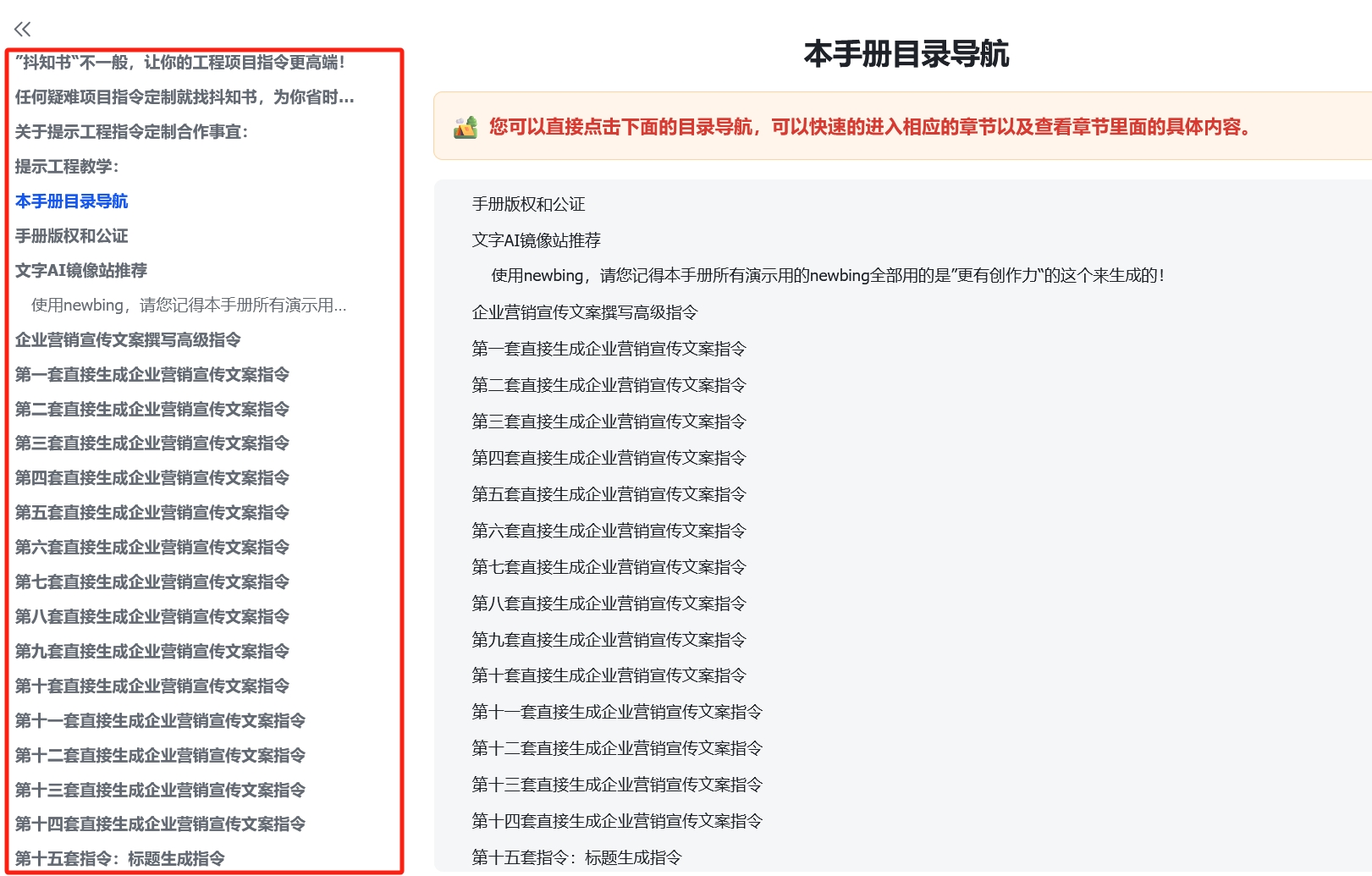 整体目录排版方式清晰、美观,方便大家更容易找到相关内容。无论你是文案小白,还是完全不懂的新手,你都可以简单、快速、方便的直接套用指令生成你符合你公司情况的宣传文章,关键还是原创!