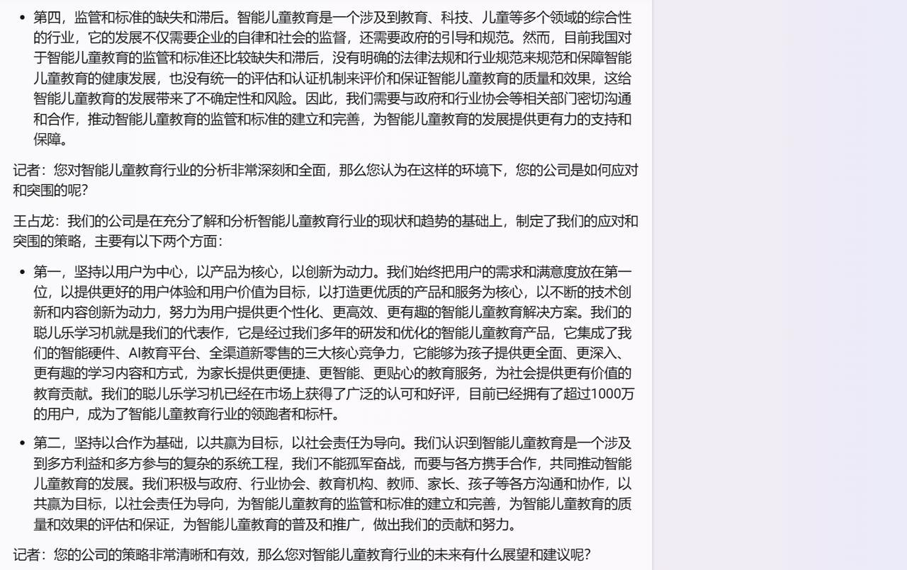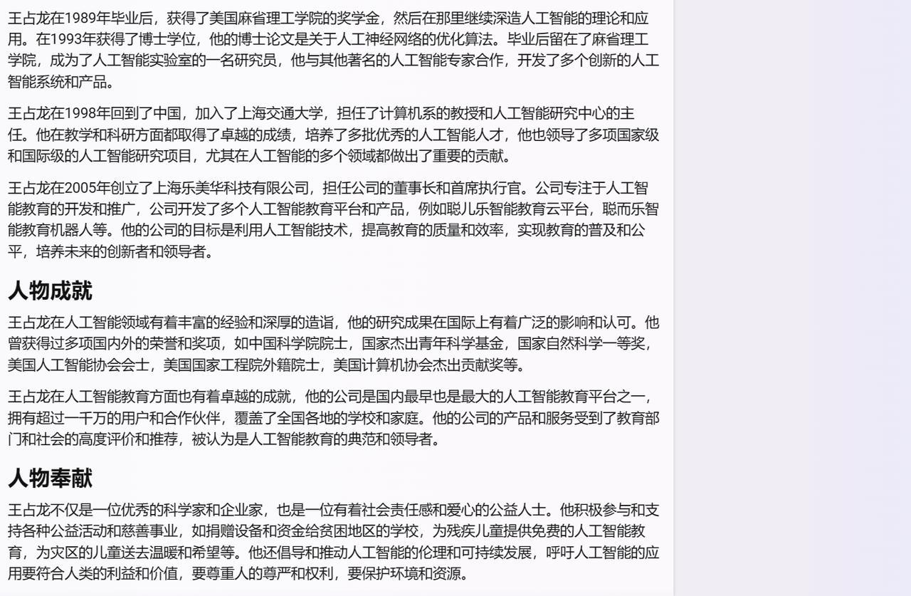 王占龙出生于1967年,他的父亲是一位数学教授,母亲是一位物理学家。他从小就对科学和技术有着浓厚的兴趣,在中学时期就开始学习编程和人工智能的基础知识。他在1985年考入清华大学计算机系,在大学期间参与了多个人工智能的研究项目,并发表了多篇学术论文。王占龙在1989年毕业后,获得了美国麻省理工学院的奖学金,然后在那里继续深造人工智能的理论和应用。在1993年获得了博士学位,他的博士论文是关于人工神经网络的优化算法。毕业后留在了麻省理工学院,成为了人工智能实验室的一名研究员,他与其他著名的人工智能专家合作,开发了多个创新的人工智能系统和产品。王占龙在1998年回到了中国,加入了上海交通大学,担任了计算机系的教授和人工智能研究中心的主任。他在教学和科研方面都取得了卓越的成绩,培养了多批优秀的人工智能人才,他也领导了多项国家级和国际级的人工智能研究项目,尤其在人工智能的多个领域都做出了重要的贡献。王占龙在2005年创立了上海乐美华科技有限公司,担任公司的董事长和首席执行官。公司专注于人工智能教育的开发和推广,公司开发了多个人工智能教育平台和产品,例如聪儿乐智能教育云平台,聪而乐智能教育机器人等。他的公司的目标是利用人工智能技术,提高教育的质量和效率,实现教育的普及和公平,培养未来的创新者和领导者。