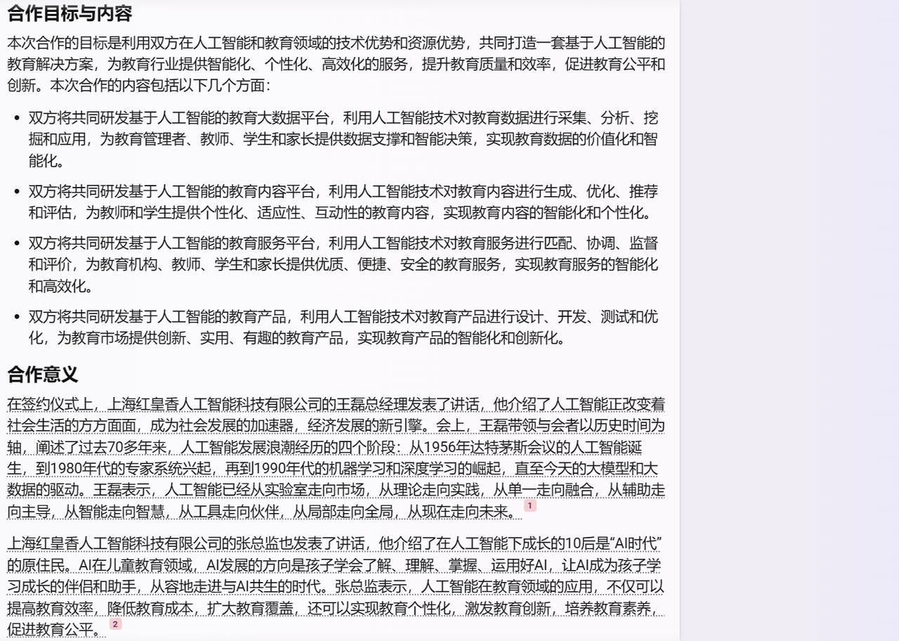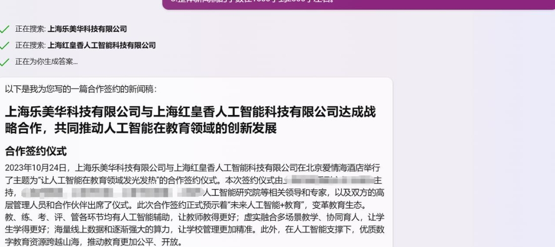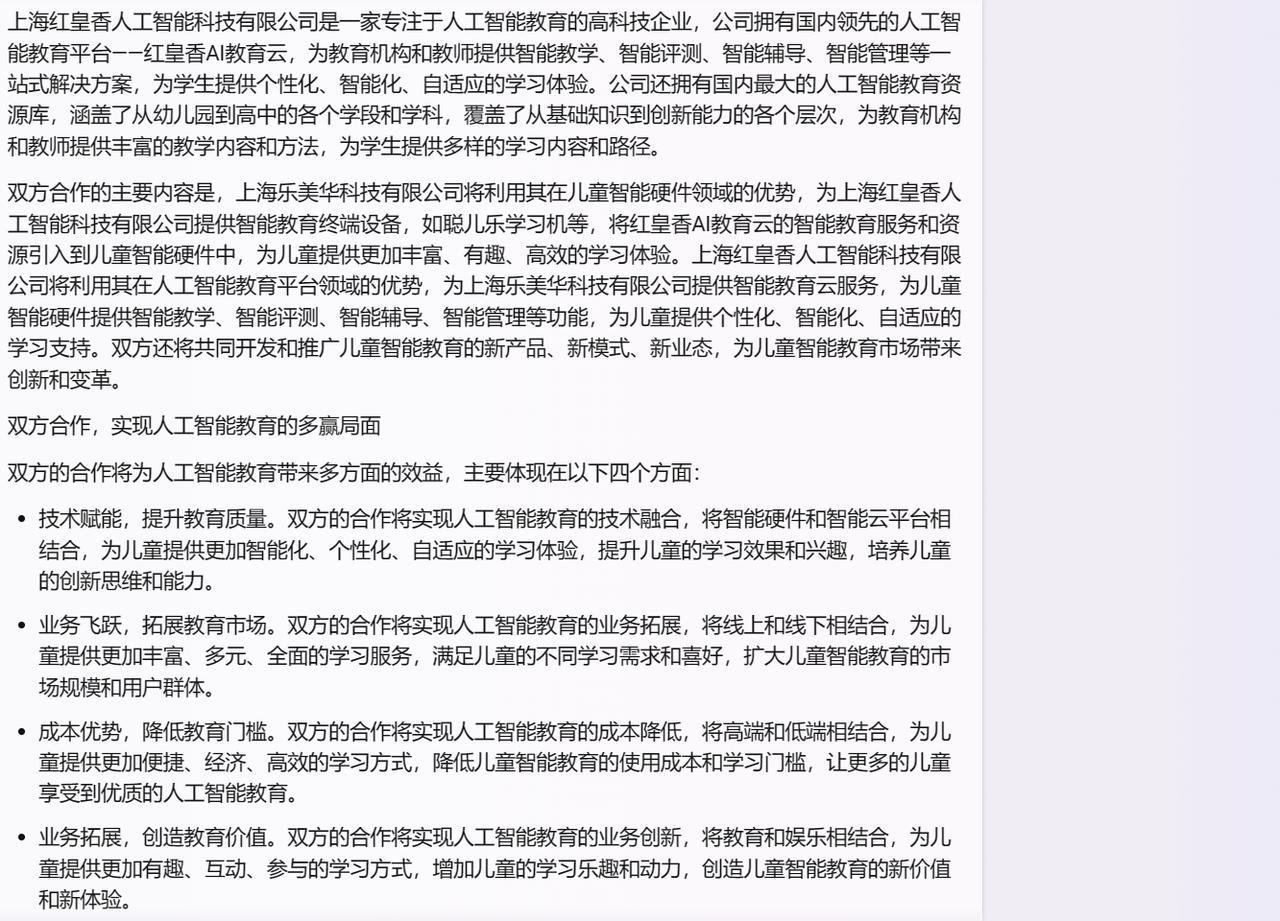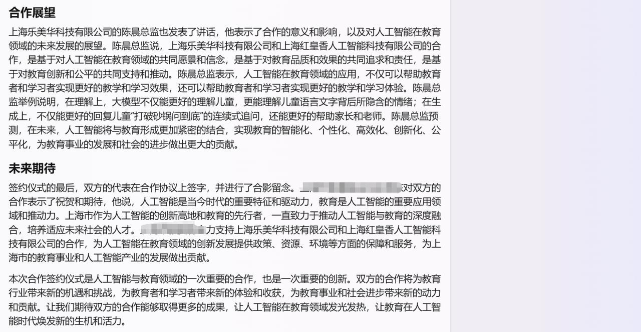 上海乐美华科技有限公司于“2023年10月24日”在北京爱情海酒店和“上海红皇香人工智能科技有限公司”进行了主题为“让人工智能在教育领域发光发热”的合作签约仪式。这次的合作签约正式预示着“未来人工智能+教育”,变革教育生态。教、练、考、评、管各环节均有人工智能辅助,让教师教得更好;虚实融合多场景教学、协同育人,让学生学得更好;海量线上数据和逐渐强大的算力,让学校管理更加精准。此外,在人工智能支撑下,优质数字教育资源跨越山海,推动教育更加公平、开放。