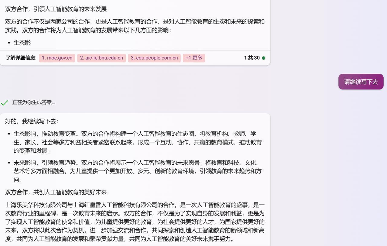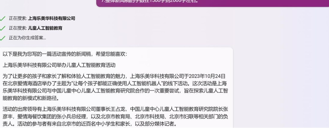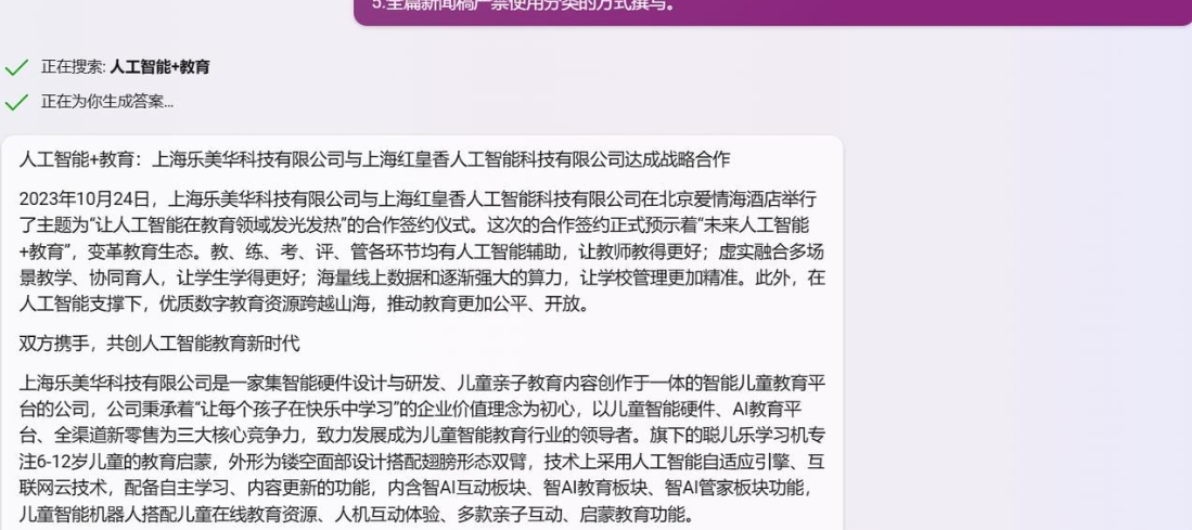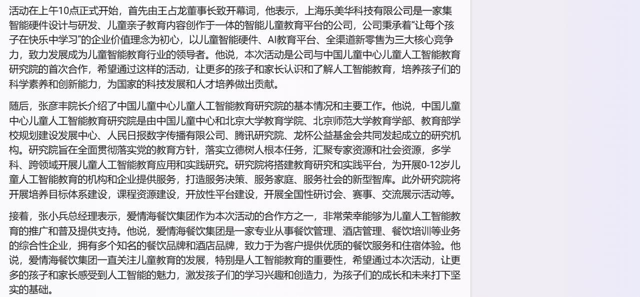 上海乐美华科技有限公司于“2023年10月24日”在北京爱情海酒店和“上海红皇香人工智能科技有限公司”进行了主题为“让人工智能在教育领域发光发热”的合作签约仪式。这次的合作签约正式预示着“未来人工智能+教育”,变革教育生态。教、练、考、评、管各环节均有人工智能辅助,让教师教得更好;虚实融合多场景教学、协同育人,让学生学得更好;海量线上数据和逐渐强大的算力,让学校管理更加精准。此外,在人工智能支撑下,优质数字教育资源跨越山海,推动教育更加公平、开放。