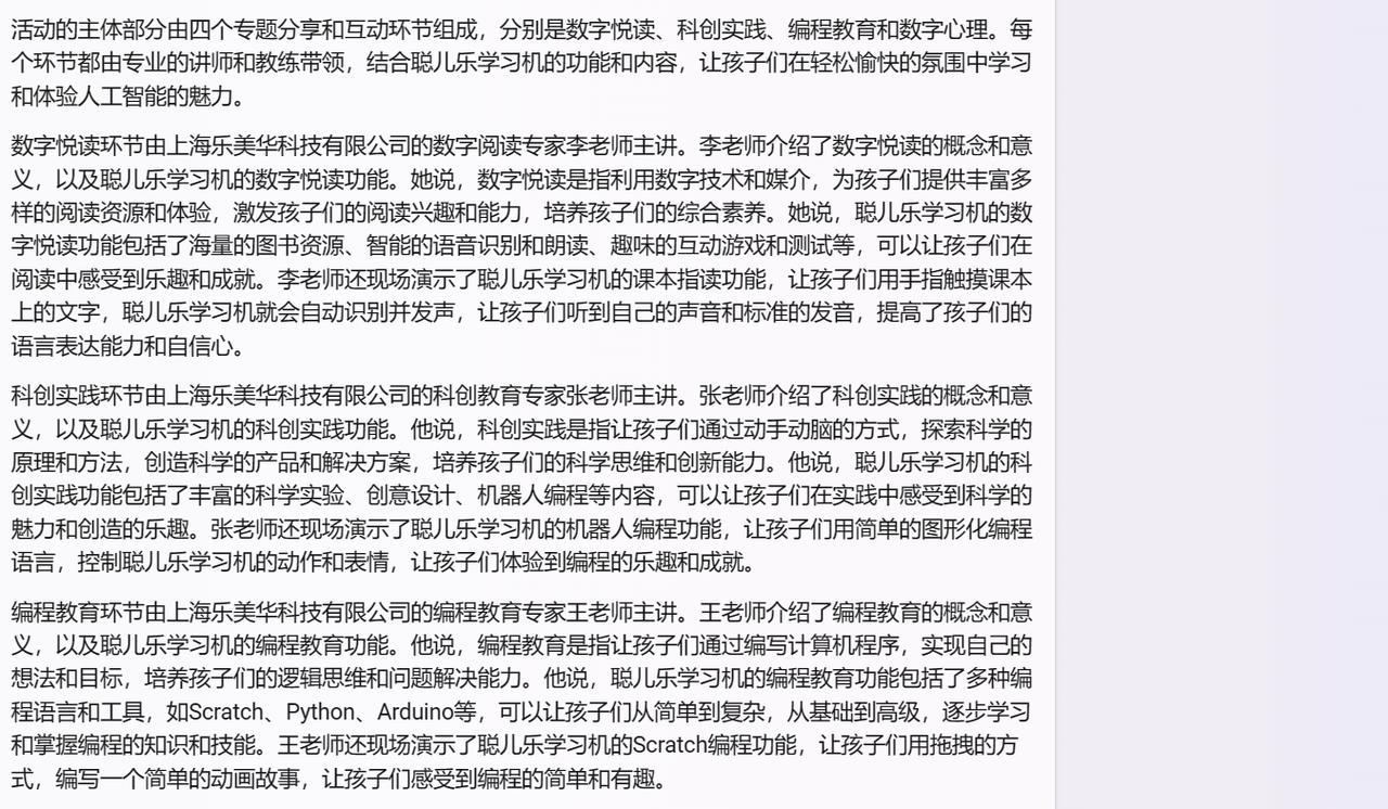 上海乐美华科技有限公司于“2023年10月24日”在北京爱情海酒店举办了主题为“让每个孩子都能正确使用人工智能机器人”的线下活动。这次的活动主要是”让各位学生了解数字悦读、科创实践、编程教育和数字心理等丰富多彩的活动,充分展示了当前儿童人工智能教育领域优质的课程教学产品和成果,在新奇有趣的互动体验中让家长和孩子们沉浸式感受高科技的魅力。“,出席的嘉宾有”上海乐美华科技有限公司董事长王占龙;爱情海餐饮集团的张小兵总经理“,嘉宾的致辞分别是{上海乐美华科技有限公司董事长王占龙说:我们企业要聚焦校外教育数字化建设和儿童人工智能教育,举办全国性的研讨活动;加强儿童人工智能教育课题研究,强化研究成果转化;不断聚合社会优质资源,增强研究院品牌影响力。;爱情海餐饮集团的张小兵总经理说:培养少年儿童科学素养是一项系统工程,少年儿童人工智能教育既蕴涵着巨大的潜能,又面临着严峻的挑战。