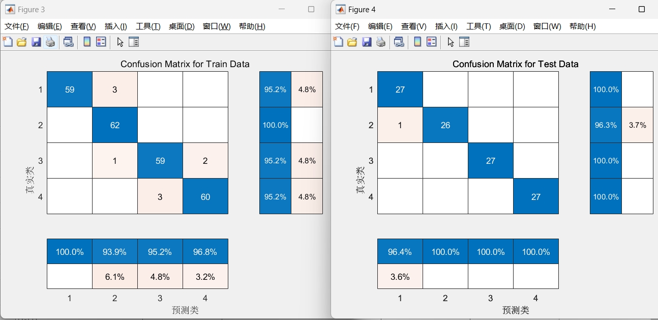 程序语言为matlab,程序可出分类效果图,迭代优化图,混淆矩阵图。