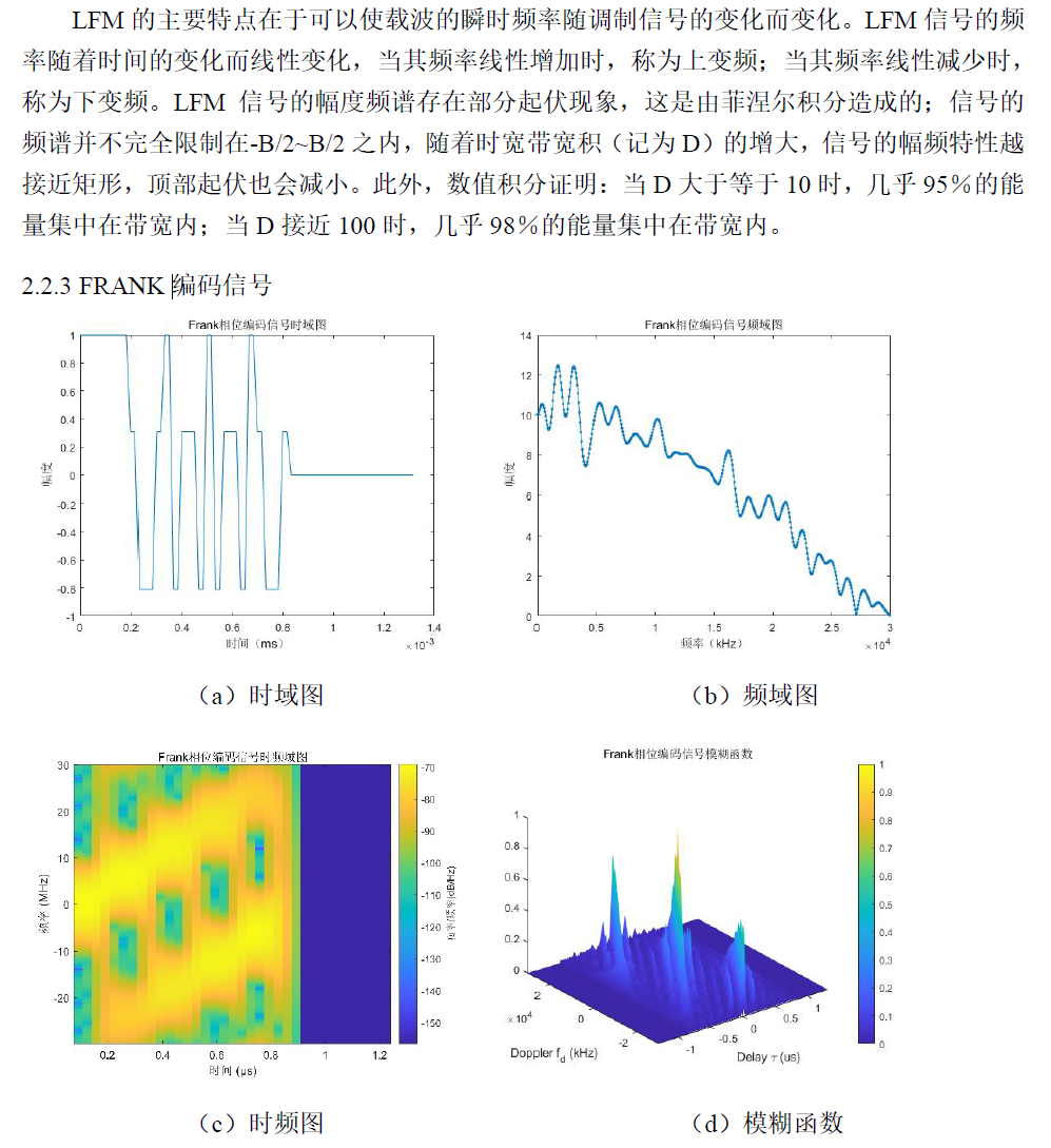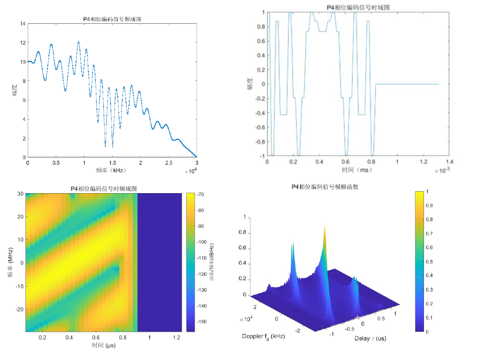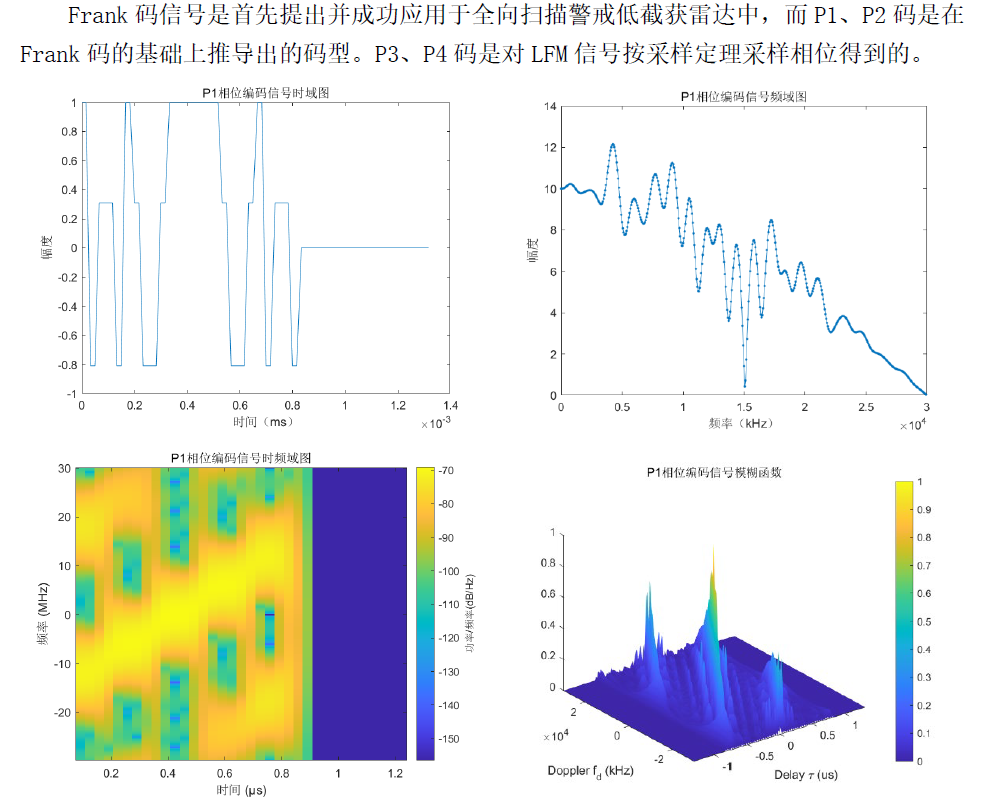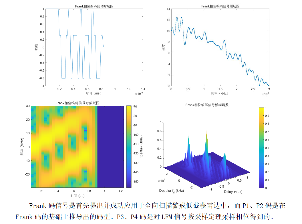 LFM、Barker、Frank、P1-P4低截获信号时频图、模糊函数图、自相关图MATLAB程序