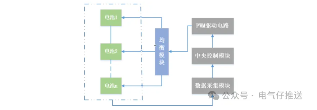 采集模块将采集到的信号经过模糊算法对 SOC 进行 估算后,当发现电池组内单体电池 SOC 差值 超过设定范围时,反馈信号经过中央处理器处理发送均衡指令,PWM 控制驱动电路 MOSFET 管开启均衡,以电感控制器作为电池能量传递的媒介,将相邻两个电池中较高 能量传递给较低能量,从而减小电池组累积的差异。
