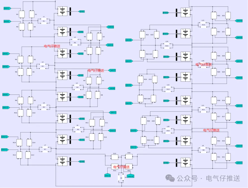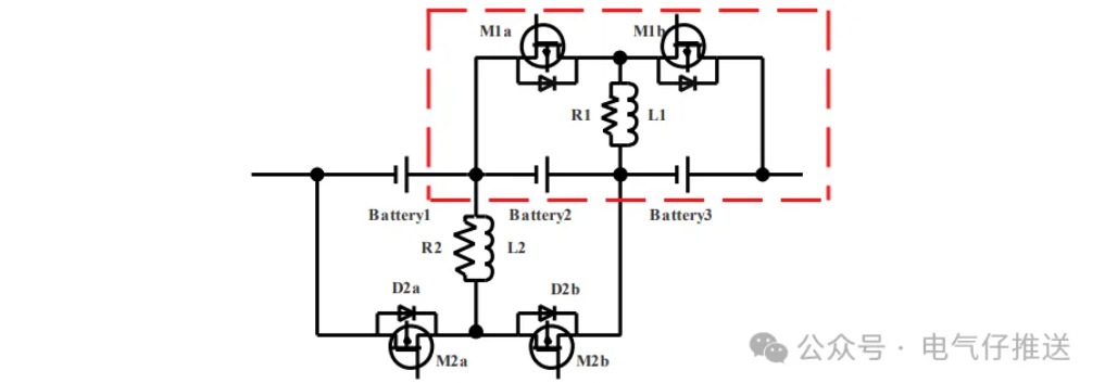 均衡电路拓扑如下图所示,该均衡电路可以完成相邻两节单体电池间的不一致性均衡,框图部分为均衡的子模块,其中 L1 电感元器件可以实现电池电能到磁能再到电能的转换以及 能量的存储,R1 为消磁电阻,消除电感中残留的磁能,防止电感出现磁饱和现象;M 是 MOSFET 的代称,它的功能主要是控制均衡电路的导通和断开;D 是体二极管的代称, 它们与 MOSFET 并联起来构成了放电回路,回路主要是转移电池和电感的能量。所设 计的这种均衡电路可以实现电池组三种工作阶段的均衡,而且电池组相邻之间电池的均 衡电路不受主路电流的干扰,因此均衡期间互不干扰,大大加快了均衡的速率。