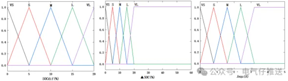 在 SOC∈(20%,80%)的范围内采用以 SOC 作为变量的 FLC 控制方案, SOCdif和∆SOC 分别设为(0,20%)和(0,60%)。转换后的模糊变量分别是 μ(x)和 μ(y)分别对应于 SOCdif和∆SOC,其各分为 5 个模糊子集:非常小(VS)、小(S)、中(M)、大(L)、非常大(VL)。