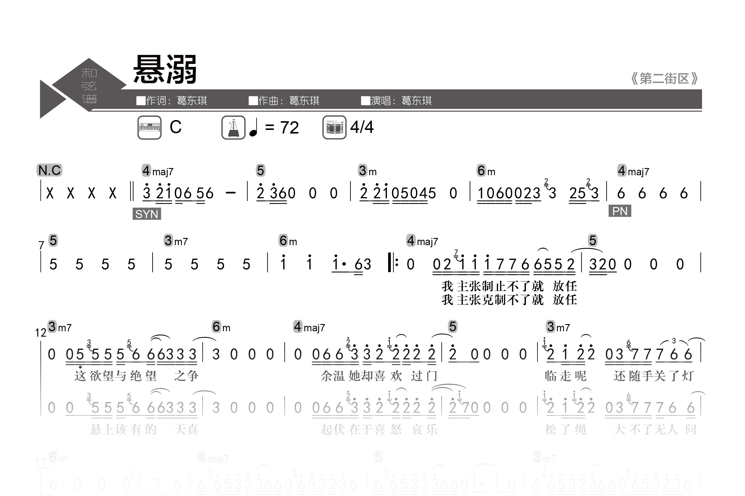 【简谱+和弦】葛东琪《悬溺》钢琴/吉他即兴用谱