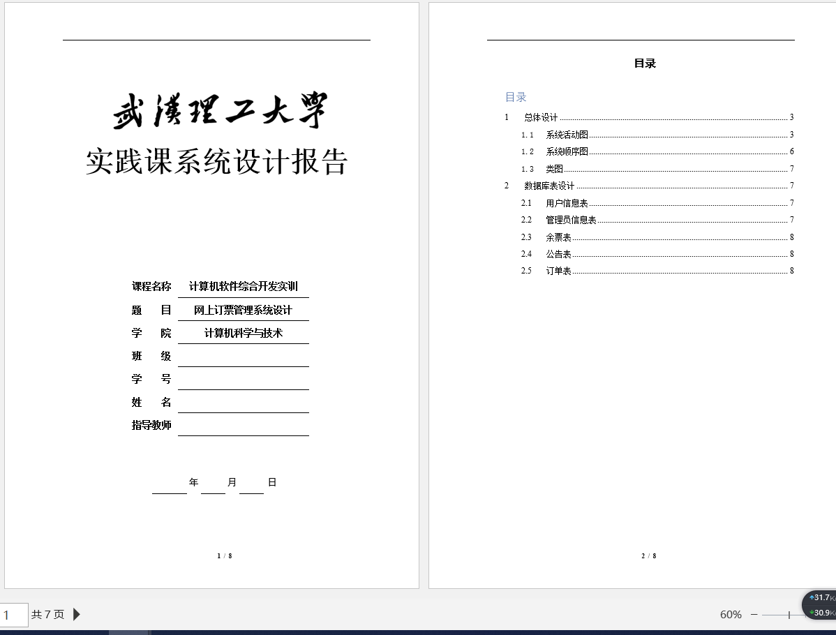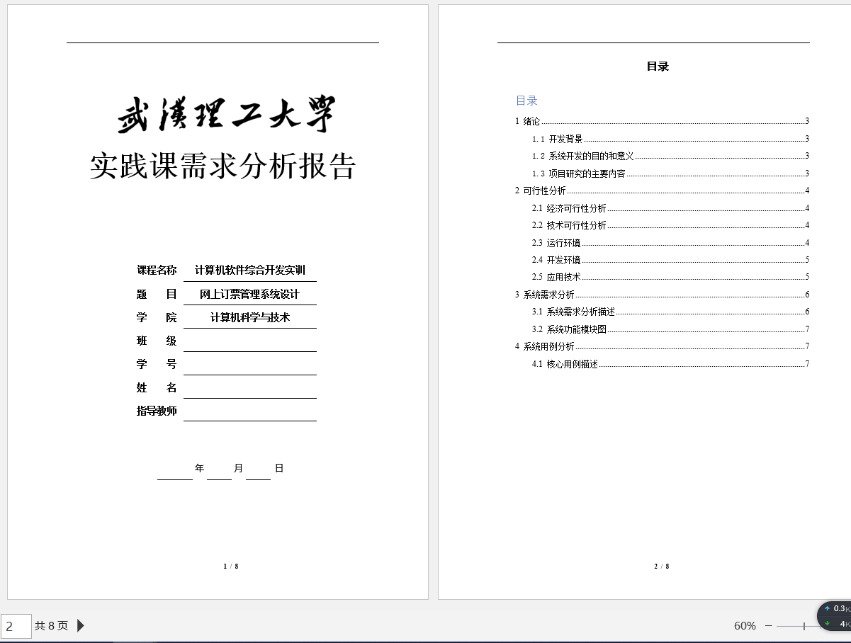 3、课程设计报告:即将以上文档进行整理归纳,并增加系统实现和系统测试等模块,进行分析论述;如下图所示: