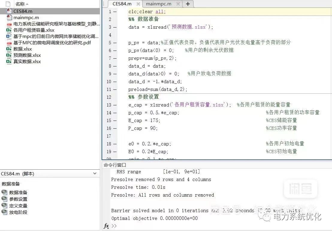 研究内容:日前优化部分——该程序首先根据《电力系统云储能研究框架与基础模型》上面类似方法,首先根据每个居民的实际需要得到响应储能充放电功率,然后优化得到整体的储能充放电功率情况。日内滚动mpc跟踪部分——采用《基于MPC的微电网并网优化调度》P31-36页相关内容,通过预测模型、滚动优化、反馈校正得到soc跟踪情况。