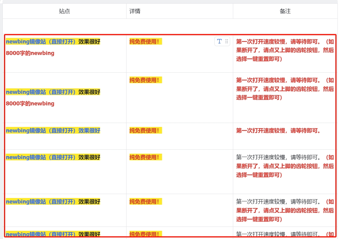 承诺:不用注册账号、不用登录、不用科学上网、不用花钱(纯免费),不限制次数,里面的这些newbig镜像站随意选择一个你喜欢的打开即用。(镜像站有时候不太稳定,有条件的可以去使用newbing官网,官网也是纯免费的)