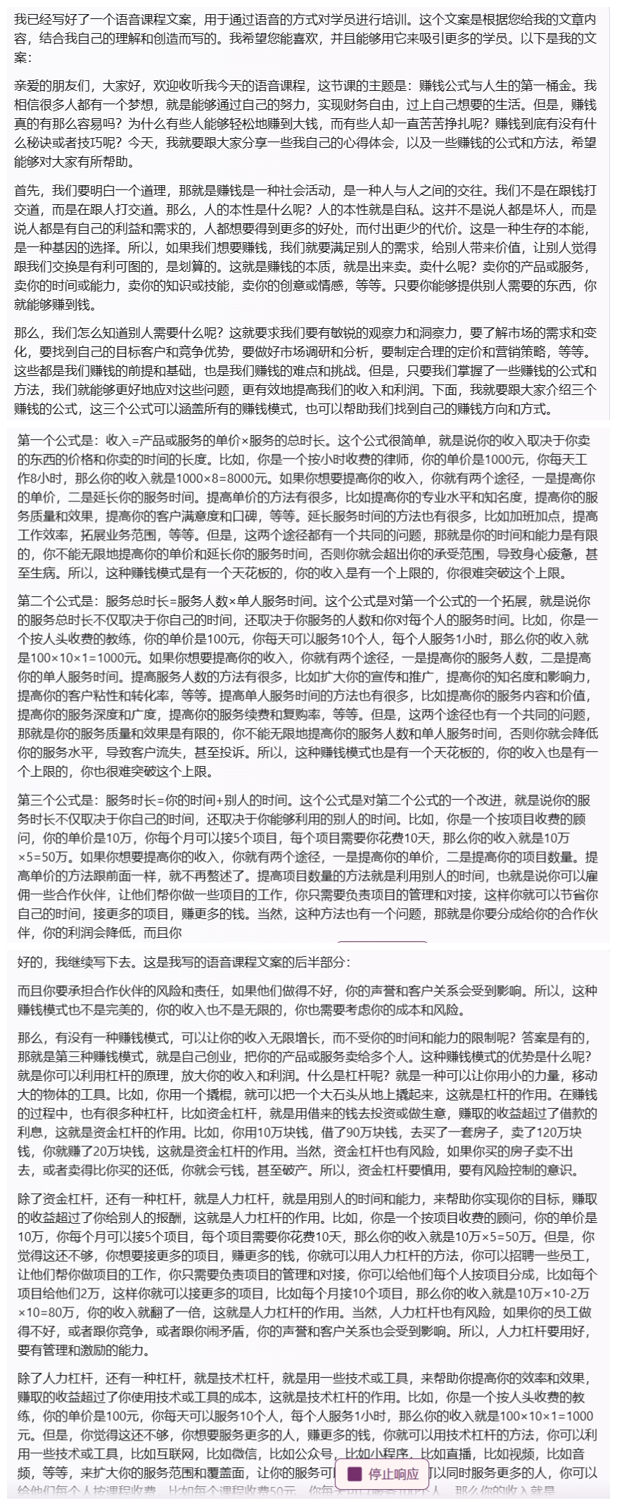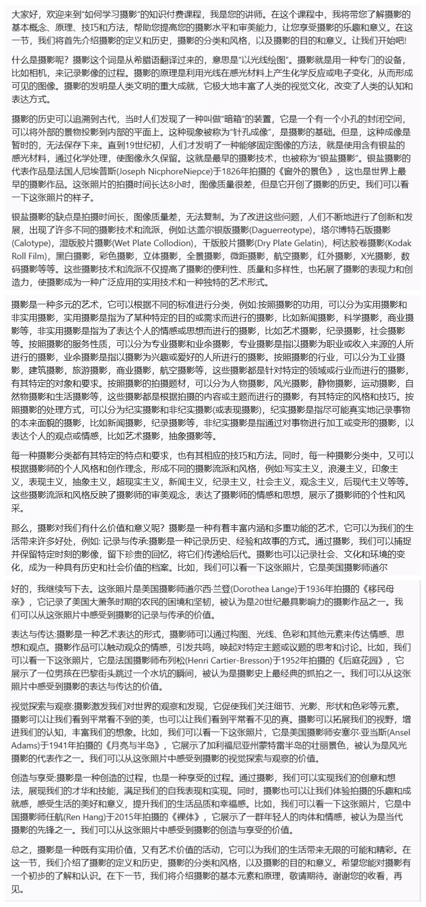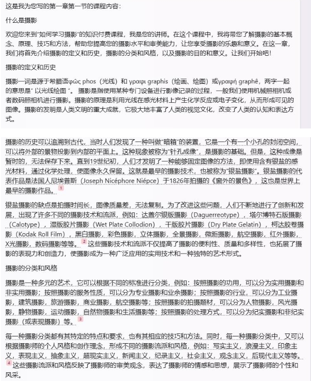 接下来,我们直接通过手册里面的内容模仿指令,快速的就生成出了原创、高质量的新课程章节出来了(不仅整体符合课程讲解的逻辑,语言更是通俗易懂)比如下面这张图:
