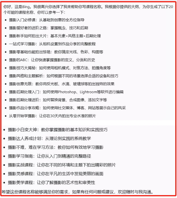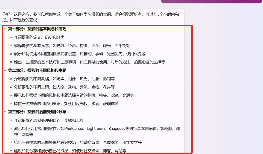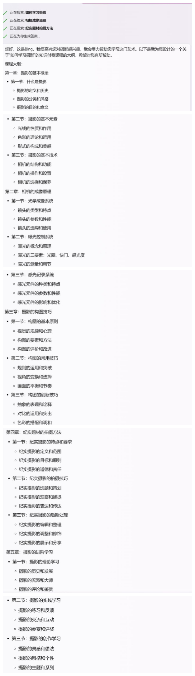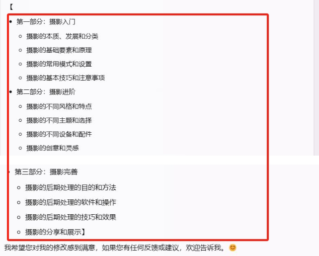 比如我们还是想写一个关于“摄影零基础”的课程,直接套用指令就能生成下面的课程大纲。