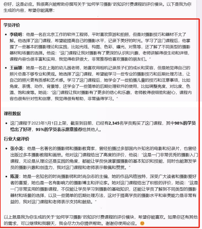 课程上架的宣传页中,一般会写上学员的评价之类的内容。现在通过指令可以直接围绕您的知识付费课程自动生成学员评价内容,比如: