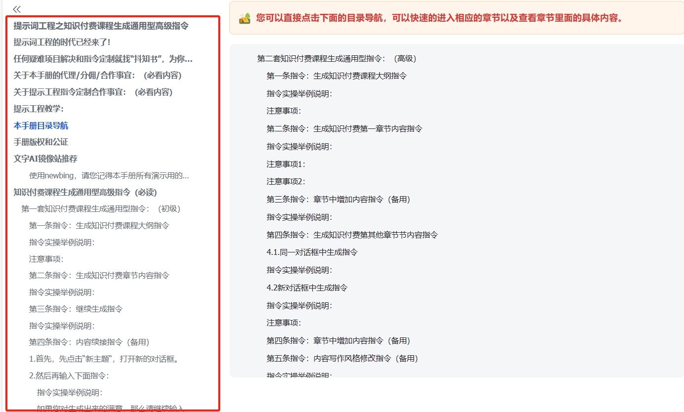 整体目录排版方式清晰、美观,方便大家更容易找到相关内容。无论你是小白,还是完全不懂的新手,你都可以简单、快速、方便的直接套用指令生成你想要的各种有深度的知识付费课程。