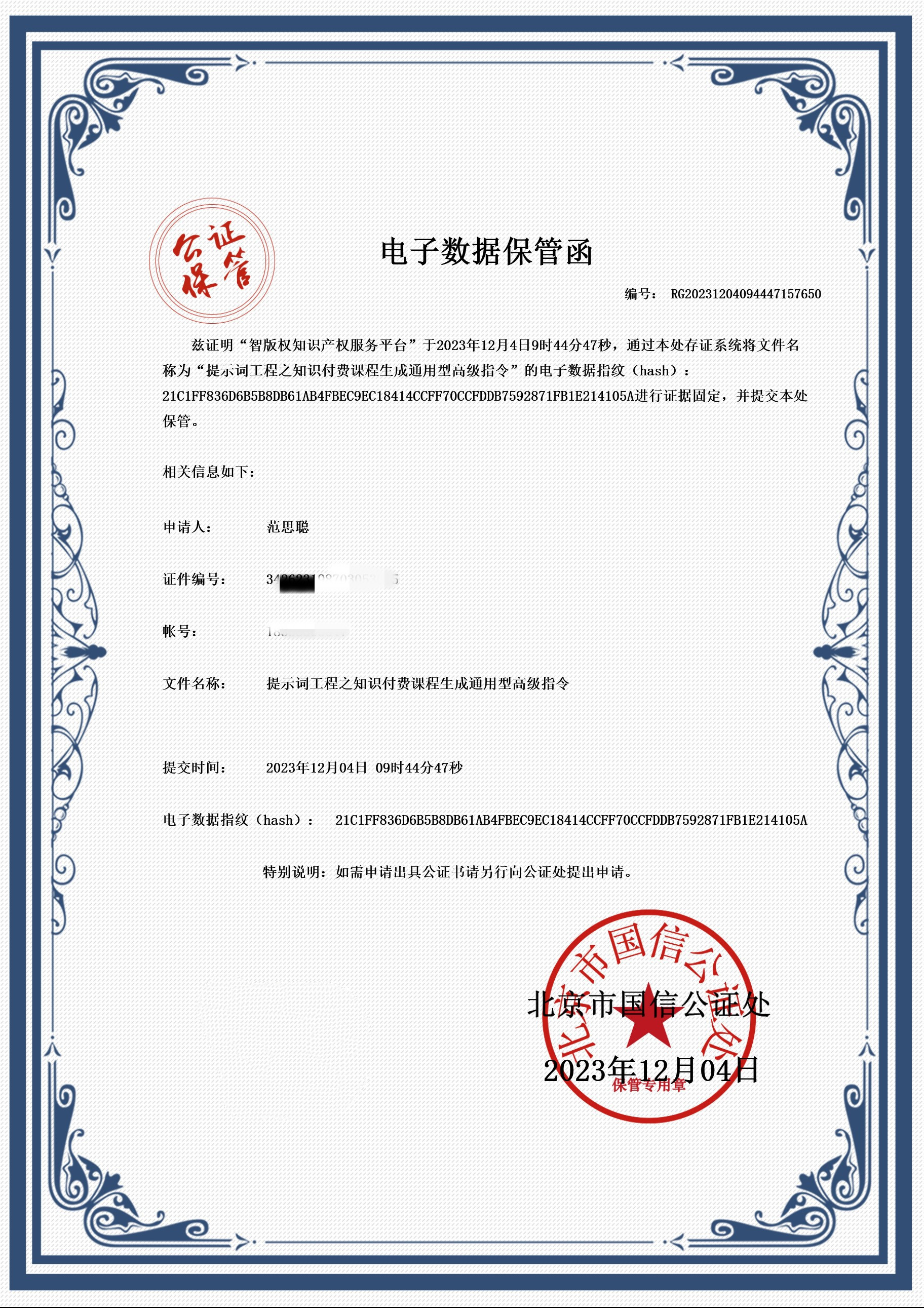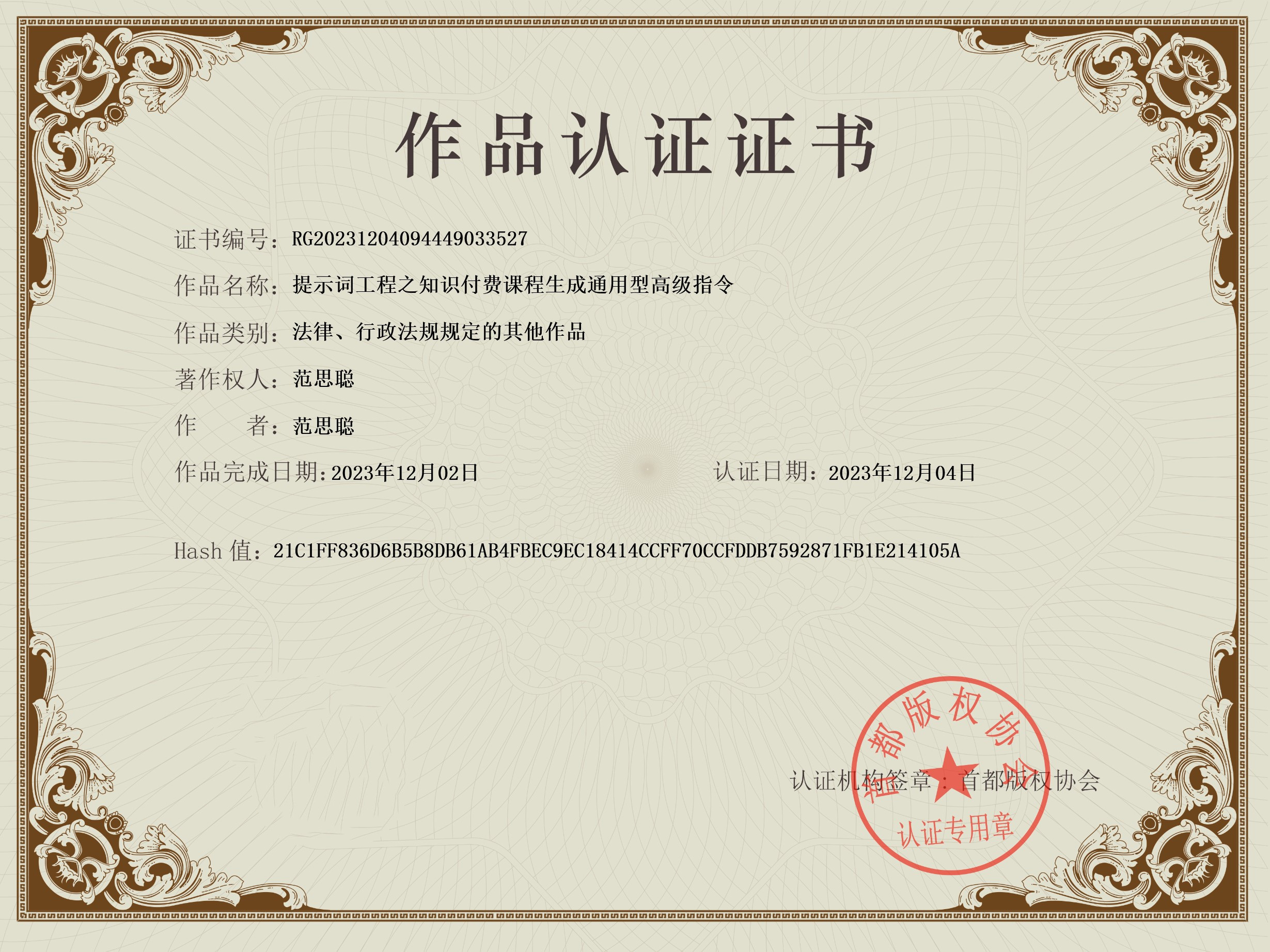 郑重声明:本手册并非市场上大量割韭菜行为的“知识付费”;本手册是一门已经申请了所有版权认证以及在北京国信公证处进行了公证的“新技能、新技术”!之所以是“新技能、新技术”,那是因为您拥有了本手册不仅可以随意的生成您想要的知识付费课程,同时掌握了这们“新技能、新技术”,您可以将生成出来的课程上架到各种知识付费平台进行变现!!!更为关键的是,根本不用刻意去学习,直接套用指令生成就刻可以了,就是这么简单、粗暴!