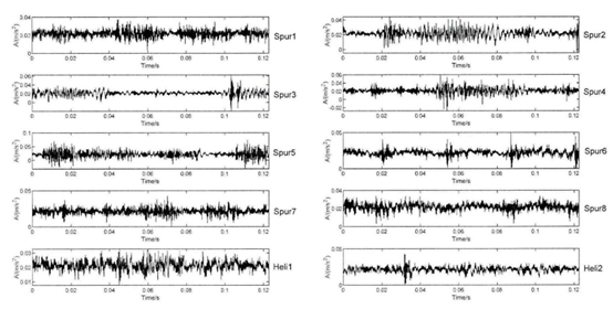 表中IS为输入轴,ID为中间轴,OS为输出轴,Spur代表安装直齿轮时不同状态下的齿轮箱故障数据,Helical代表斜齿轮,其对应的时域图如下图所示,每个故障信号取8192个数据点。