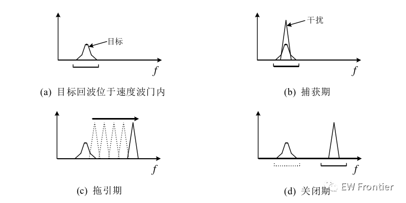 速度波门拖引干扰常用于扰乱速度跟踪系统。图2给出了速度波门拖引干扰下 雷达速度波门的变化情况[41]。在成功识别出雷达工作参数之后,干扰机对截获的雷达 信号增添一个虚假的多普勒频率,并放大转发给雷达接收机,而AGC电路响应大功率 信号,这样雷达速度跟踪波门便被干扰所捕获(捕获期,捕获期的时间长度约0.5~2 s) [42]。然后逐渐拖离干扰的多普勒频率(拖引期,拖引速度 应不大于目标的最 大加速度[42])。当速度跟踪波门被拖离至距离目标速度波门多个波门宽度的位置时, 关闭干扰机一段时间(关闭期,时间长度约0.5~2 s),此时雷达因丢失真实目标而不 得不重新搜索。