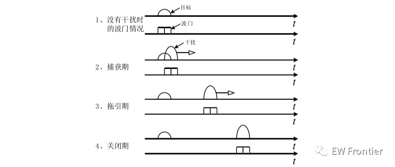 图1是对敌方雷达施加距离波门拖引干扰时雷达距离波门的变化情况[41],距离 波门拖引干扰的详细工作过程如下: