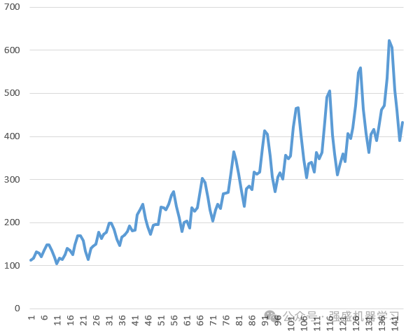 下图为1949年到1960年每月国际航空公司的乘客人数。从中可以看到明显的季节性,该周期为12个月。