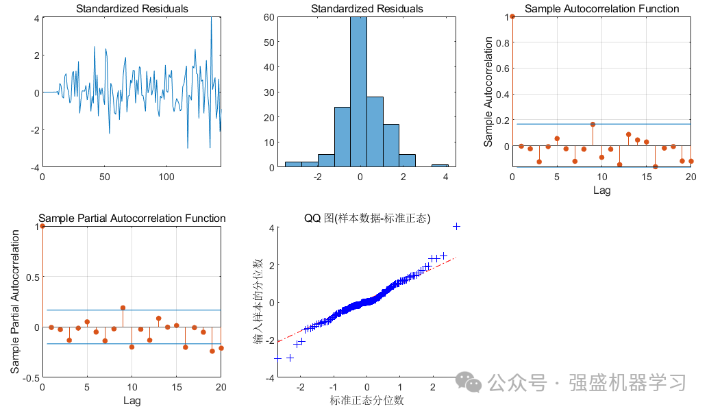 为了确保确定的阶数合适,还需要进行残差检验。残差即原始信号减掉模型拟合出的信号后的残余信号。如果残差是随机正态分布的、不自相关的,这说明残差是一段白噪声信号,也就说明有用的信号已经都被提取到ARMA模型中了。