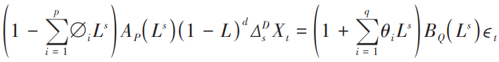 SARIMA 模型是在 ARIMA 模型的基础上增加了3个超参数P、D、Q,以及一个额外的季节性周期参数S,能够采用 Box-Jenkins 方法的模型识别、估计和预测程序,因此方便随着更多历史数据的获得而对模型进行实时调整,其一般表达式为:
