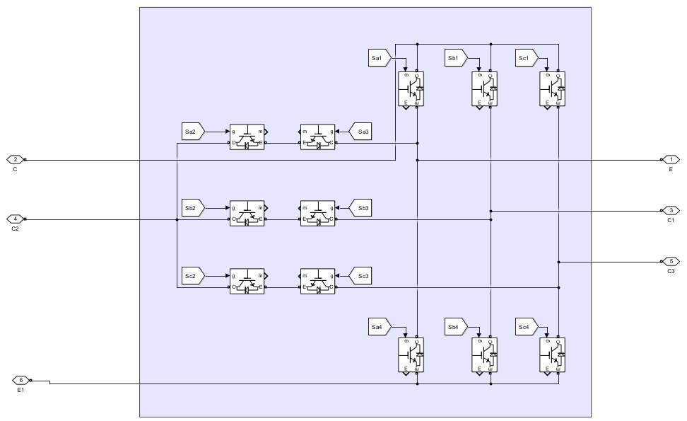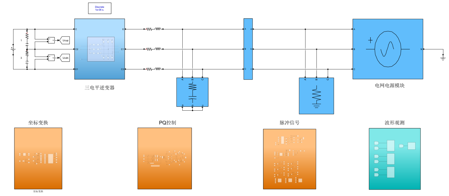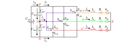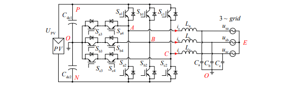 三相 T 型三电平逆变器电路如图所示,逆变器主回路由三个单相 T 型逆变器组成。 直流侧输入电压为 UPV,直流侧中点电位 O 设为零电位,交流侧输出侧是三相三线制连接, 三相电网电压为 usa、usb、usc,三相并网电感电流为 ia、ib、ic。