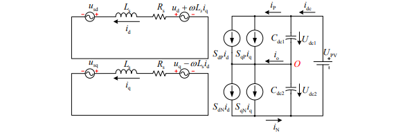 通过 Park 变换将三相 T 型三电平电路在静止 αβ 坐标系下的数学模型转换到旋转 dq 坐标 系下。静止 αβ 坐标系到旋转 dq 坐标系,在旋转 dq 坐标系下,三相 T 型三电平电路的等效电路如图 所示: