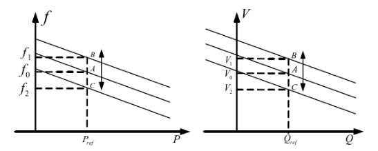 当系统频率为额定频率f0时,系统稳定在A点,系统的输出为 有功参考值Pref,如果系统频率相应增大,则系统运行状态由A点过渡到B点, 但是其系统的输出依旧为有功参考值Pref;相反,如系统频率相应减小,则系统 运行状态由A点过渡到C点,而其系统的输出依旧还是为有功参考值Pref。 同理分析图2.9(b),端口电压的幅值无论变大或是变小,系统输出的无功功率依 旧是无功参考值Qref。